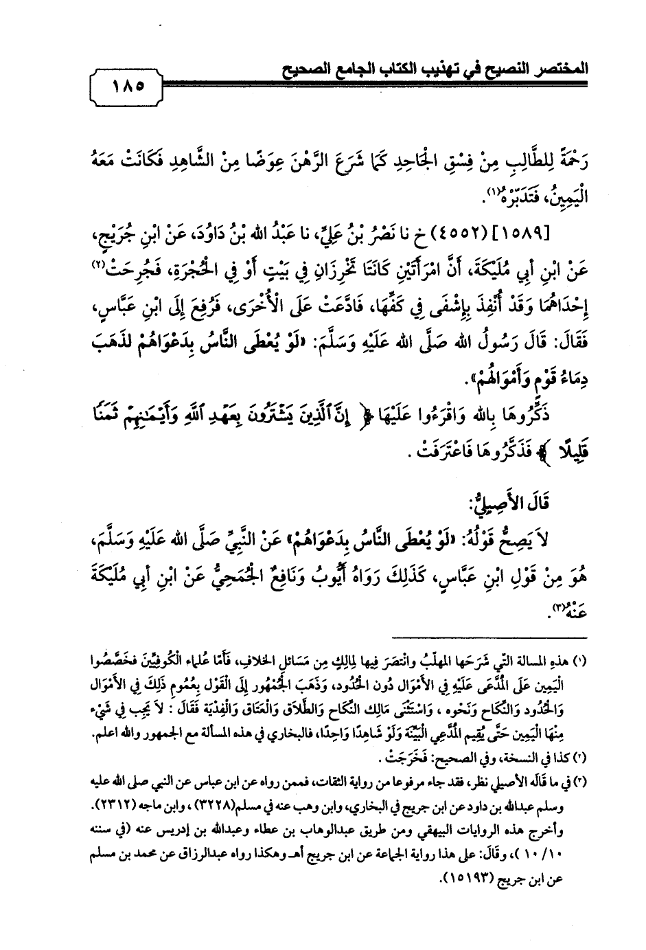 لاَ يَصِحُّ قَوْلُهُ: «لَوْ يُعْطَى النَّاسُ بِدَعْوَاهُمْ» عَنْ النَّبِيِّ صَلَّى الله عَلَيْهِ وَسَلَّمَ, هُوَ مِنْ قَوْلِ ابْنِ عَبَّاسٍ، كَذَلِكَ رَوَاهُ أَيُّوبُ وَنَافِعٌ الْجُمَحِيُّ عَنْ ابْنِ أبِي مُلَيْكَةَ عَنْهُ (¬3).
