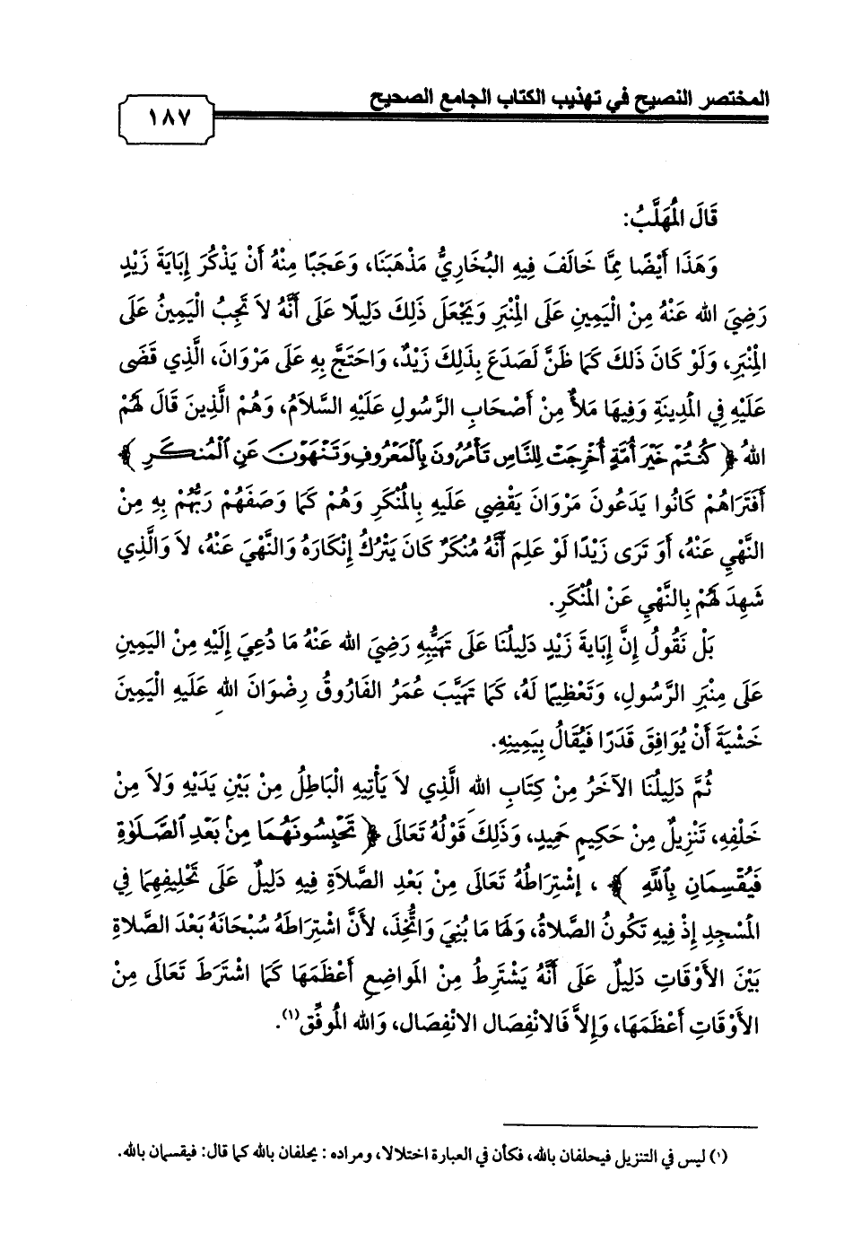 وَهَذَا أَيْضًا مِمَّا خَالَفَ فِيهِ البُخَارِيُّ مَذْهَبَنَا، وَعَجَبًا مِنْهُ أَنْ يَذْكُرَ إِبَايَةَ زَيْدٍ رَضِيَ الله عَنْهُ مِنْ الْيَمِينِ عَلَى الْمِنْبَرِ وَيَجْعَلَ ذَلِكَ دَلِيلًا عَلَى أَنَّهُ لاَ تَجِبُ الْيَمِينُ عَلَى الْمِنْبَرِ، وَلَوْ كَانَ ذَلكَ كَمَا ظَنَّ لَصَدَعَ بِذَلِكَ زَيْدٌ، وَاحَتَجَّ بِهِ عَلَى مَرْوَانَ، الَّذِي قَضَى عَلَيْهِ فِي الْمَدِينَةِ وَفِيهَا مَلأٌ مِنْ أَصْحَابِ الرَّسُولِ عَلَيْهِ السَّلاَمُ، وَهُمْ الَّذِينَ قَالَ لَهُمْ اللهُ {كُنْتُمْ خَيْرَ أُمَّةٍ أُخْرِجَتْ لِلنَّاسِ تَأْمُرُونَ بِالْمَعْرُوفِ وَتَنْهَوْنَ عَنِ الْمُنْكَرِ}، أَفَتَرَاهُمْ كَانُوا يَدَعُونَ مَرْوَانَ يَقْضِي عَلَيهِ بِالْمُنْكَرِ وَهُمْ كَمَا وَصَفَهُمْ رَبُّهُمْ بِهِ مِنْ النَّهْيِ عَنْهُ, أَوَ تَرَى زَيْدًا لَوْ عَلِمَ أّنَّهُ مُنْكَرٌ كَانَ يَتْرُكُ إِنْكَارَهُ وَالنَّهْيَ عَنْهُ، لاَ وَالَّذِي شَهِدَ لَهُمْ بِالنَّهْيِ عَنْ الْمُنْكَرِ.
