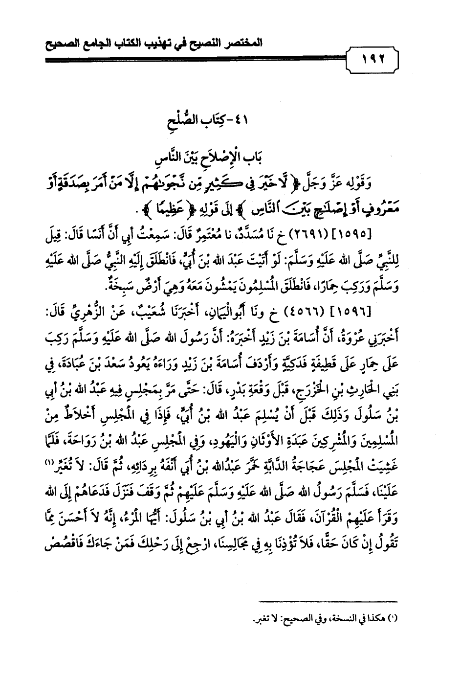 [1595] (2691) خ نَا مُسَدَّدٌ، نا مُعْتَمِرٌ قَالَ: سَمِعْتُ أبِي أَنَّ أَنَسًا قَالَ: قِيلَ لِلنَّبِيِّ صَلَّى الله عَلَيْهِ وَسَلَّمَ: لَوْ أَتَيْتَ عَبْدَ الله بْنَ أُبَيٍّ، فَانْطَلَقَ إِلَيْهِ النَّبِيُّ صَلَّى الله عَلَيْهِ وَسَلَّمَ وَرَكِبَ حِمَارًا، فَانْطَلَقَ الْمُسْلِمُونَ يَمْشُونَ مَعَهُ وَهِيَ أَرْضٌ سَبِخَةٌ.