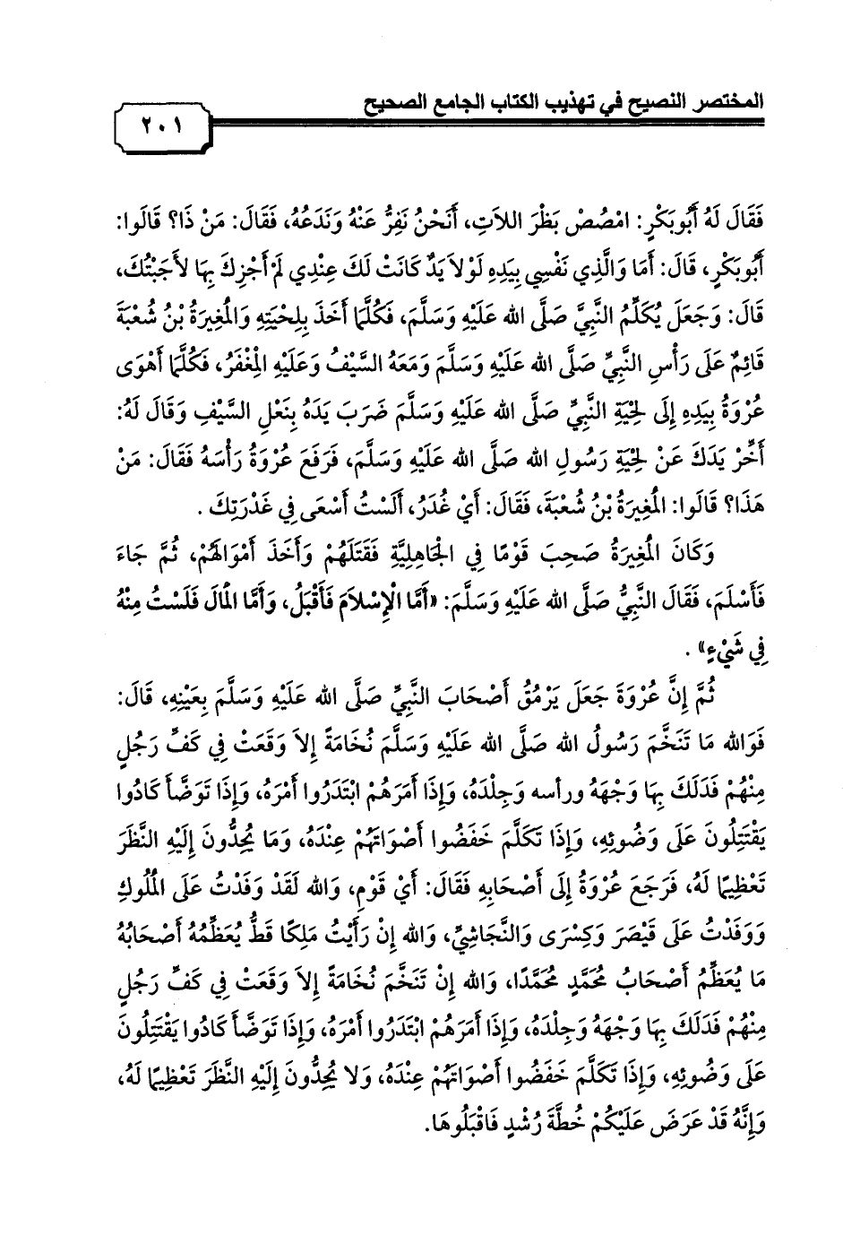 فَقَالَ لَهُ أَبُوبَكْرٍ: امْصُصْ بَظْرَ اللاَتِ، أَنَحْنُ نَفِرُّ عَنْهُ وَنَدَعُهُ، فَقَالَ: مَنْ ذَا؟ قَالَوا: أَبُوبَكْرٍ، قَالَ: أَمَا وَالَّذِي نَفْسِي بِيَدِهِ لَوْلاَ يَدٌ كَانَتْ لَكَ عِنْدِي لَمْ أَجْزِكَ بِهَا لأَجَبْتُكَ، قَالَ: وَجَعَلَ يُكَلِّمُ النَّبِيَّ صَلَّى الله عَلَيْهِ وَسَلَّمَ، فَكُلَّمَا أَخَذَ بِلِحْيَتِهِ وَالْمُغِيرَةُ بْنُ شُعْبَةَ قَائِمٌ عَلَى رَأْسِ النَّبِيِّ صَلَّى الله عَلَيْهِ وَسَلَّمَ وَمَعَهُ السَّيْفُ وَعَلَيْهِ الْمِغْفَرُ، فَكُلَّمَا أَهْوَى عُرْوَةُ بِيَدِهِ إِلَى لِحْيَةِ النَّبِيِّ صَلَّى الله عَلَيْهِ وَسَلَّمَ ضَرَبَ يَدَهُ بِنَعْلِ السَّيْفِ وَقَالَ لَهُ: أَخِّرْ يَدَكَ عَنْ لِحْيَةِ رَسُولِ الله صَلَّى الله عَلَيْهِ وَسَلَّمَ، فَرَفَعَ عُرْوَةُ رَأْسَهُ فَقَالَ: مَنْ هَذَا؟ قَالَوا: الْمُغِيرَةُ بْنُ شُعْبَةَ، فَقَالَ: أَيْ غُدَرُ، أَلَسْتُ أَسْعَى فِي غَدْرَتِكَ.