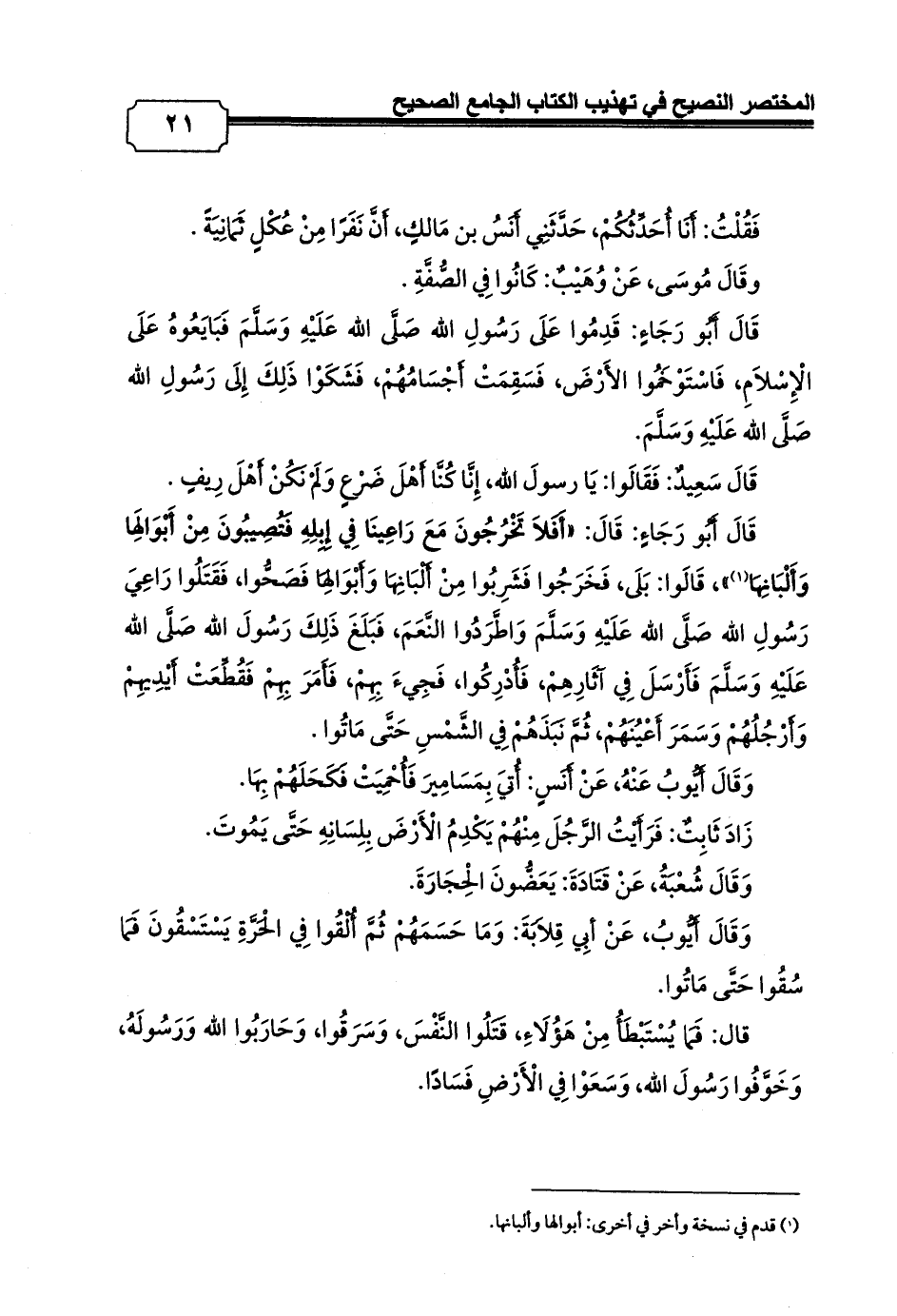 قَالَ أَبُو رَجَاءٍ: قَالَ: «أَفَلاَ تَخْرُجُونَ مَعَ رَاعِينَا فِي إِبِلِهِ فَتُصِيبُونَ مِنْ أَبْوَالِهَا وَأَلْبَانِهَا (¬1)»، قَالَوا: بَلَى, فَخَرَجُوا فَشَرِبُوا مِنْ أَلْبَانِهَا وَأَبْوَالِهَا فَصَحُّوا, فَقَتَلُوا رَاعِيَ رَسُولِ الله صَلَّى الله عَلَيْهِ وَسَلَّمَ وَاطَّرَدُوا النَّعَمَ, فَبَلَغَ ذَلِكَ رَسُولَ الله صَلَّى الله عَلَيْهِ وَسَلَّمَ فَأَرْسَلَ فِي آثَارِهِمْ, فَأُدْرِكُوا, فَجِيءَ بِهِمْ, فَأَمَرَ بِهِمْ فَقُطِّعَتْ أَيْدِيهِمْ وَأَرْجُلُهُمْ وَسَمَرَ أَعْيُنَهُمْ, ثُمَّ نَبَذَهُمْ فِي الشَّمْسِ حَتَّى مَاتُوا.