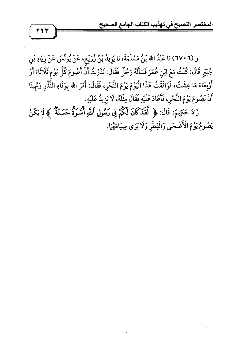 زَادَ حَكِيمٌ: قَالَ: {لَقَدْ كَانَ لَكُمْ فِي رَسُولِ اللَّهِ أُسْوَةٌ حَسَنَةٌ} لَمْ يَكُنْ يَصُومُ يَوْمَ الْأَضْحَى وَالْفِطْرِ وَلَا يَرَى صِيَامَهُمَا.