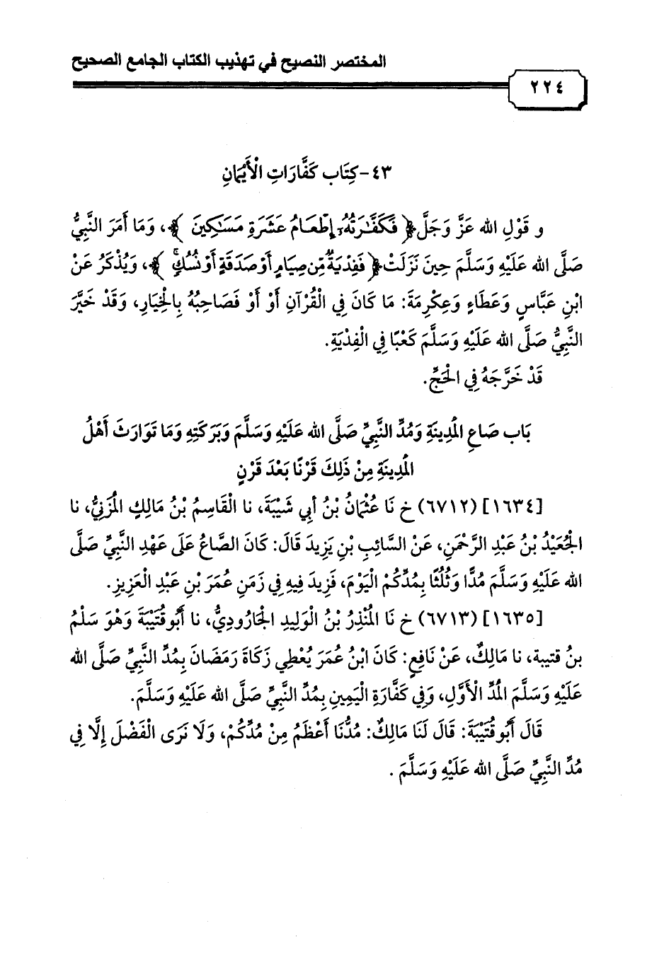[1635] (6713) خ نَا المُنْذِرُ بْنُ الْوَلِيدِ الْجَارُودِيُّ، نا أَبُوقُتَيْبَةَ وَهْوَ سَلْمُ بنُ قتيبة، نا مَالِكٌ، عَنْ نَافِعٍ: كَانَ ابْنُ عُمَرَ يُعْطِي زَكَاةَ رَمَضَانَ بِمُدِّ النَّبِيِّ صَلَّى الله عَلَيْهِ وَسَلَّمَ الْمُدِّ الْأَوَّلِ، وَفِي كَفَّارَةِ الْيَمِينِ بِمُدِّ النَّبِيِّ صَلَّى الله عَلَيْهِ وَسَلَّمَ.