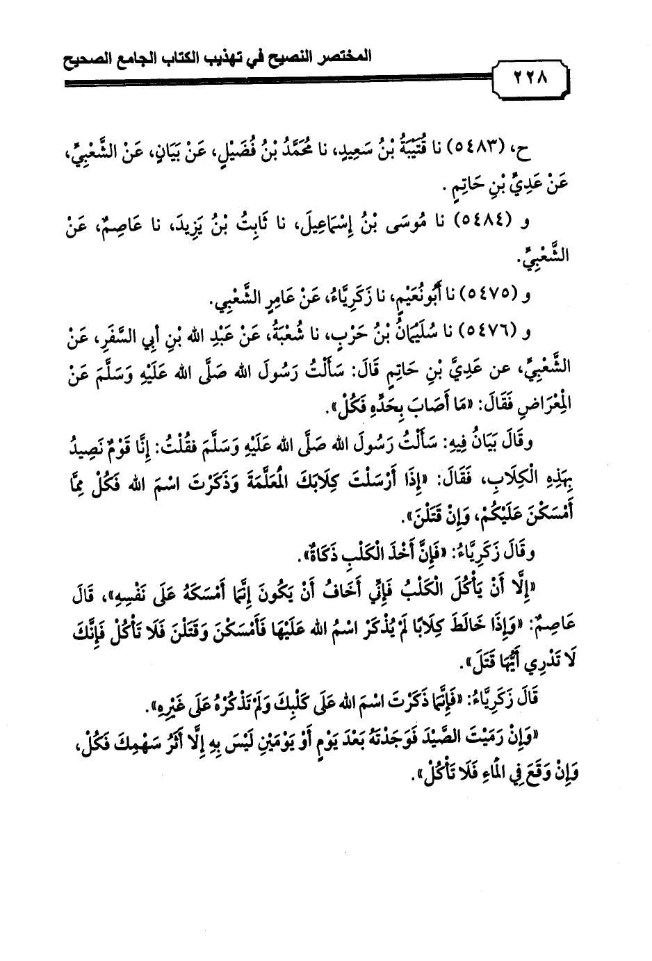 و (5476) نا سُلَيْمَانُ بْنُ حَرْبٍ، نا شُعْبَةُ، عَنْ عَبْدِ الله بْنِ أبِي السَّفَرِ، عَنْ الشَّعْبِيِّ، عن عَدِيَّ بْنِ حَاتِمٍ قَالَ: سَأَلْتُ رَسُولَ الله صَلَّى الله عَلَيْهِ وَسَلَّمَ عَنْ الْمِعْرَاضِ فَقَالَ: «مَا أَصَابَ بِحَدِّهِ فَكُلْ».