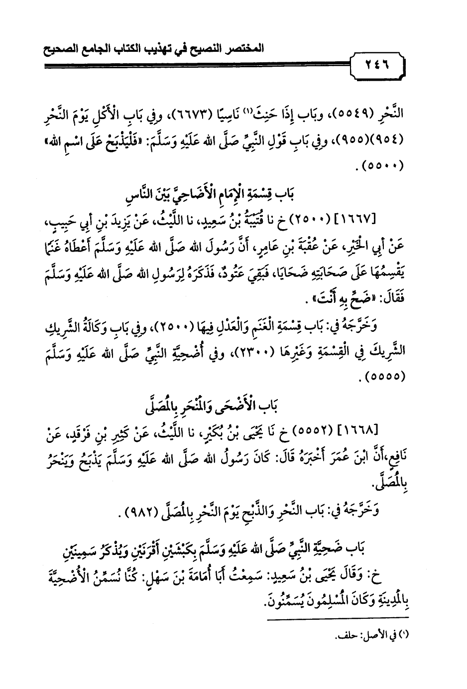 وَخَرَّجَهُ في: بَاب قِسْمَةِ الْغَنَمِ وَالْعَدْلِ فِيهَا (2500) , وفِي بَابِ وَكَالَةُ الشَّرِيكِ الشَّرِيكَ فِي الْقِسْمَةِ وَغَيْرِهَا (2300) , وفي أُضْحِيَّةِ النَّبِيِّ صَلَّى الله عَلَيْهِ وَسَلَّمَ (5555).