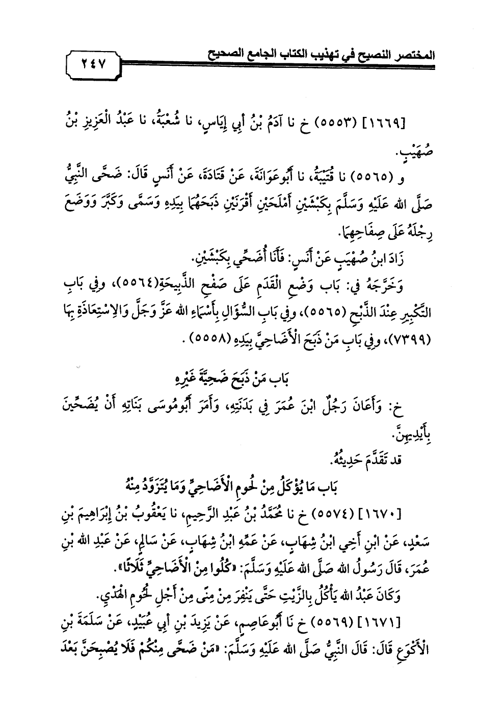 و (5565) نا قُتَيْبَةُ، نا أَبُوعَوَانَةَ، عَنْ قَتَادَةَ، عَنْ أَنَسٍ قَالَ: ضَحَّى النَّبِيُّ صَلَّى الله عَلَيْهِ وَسَلَّمَ بِكَبْشَيْنِ أَمْلَحَيْنِ أَقْرَنَيْنِ ذَبَحَهُمَا بِيَدِهِ وَسَمَّى وَكَبَّرَ وَوَضَعَ رِجْلَهُ عَلَى صِفَاحِهِمَا.