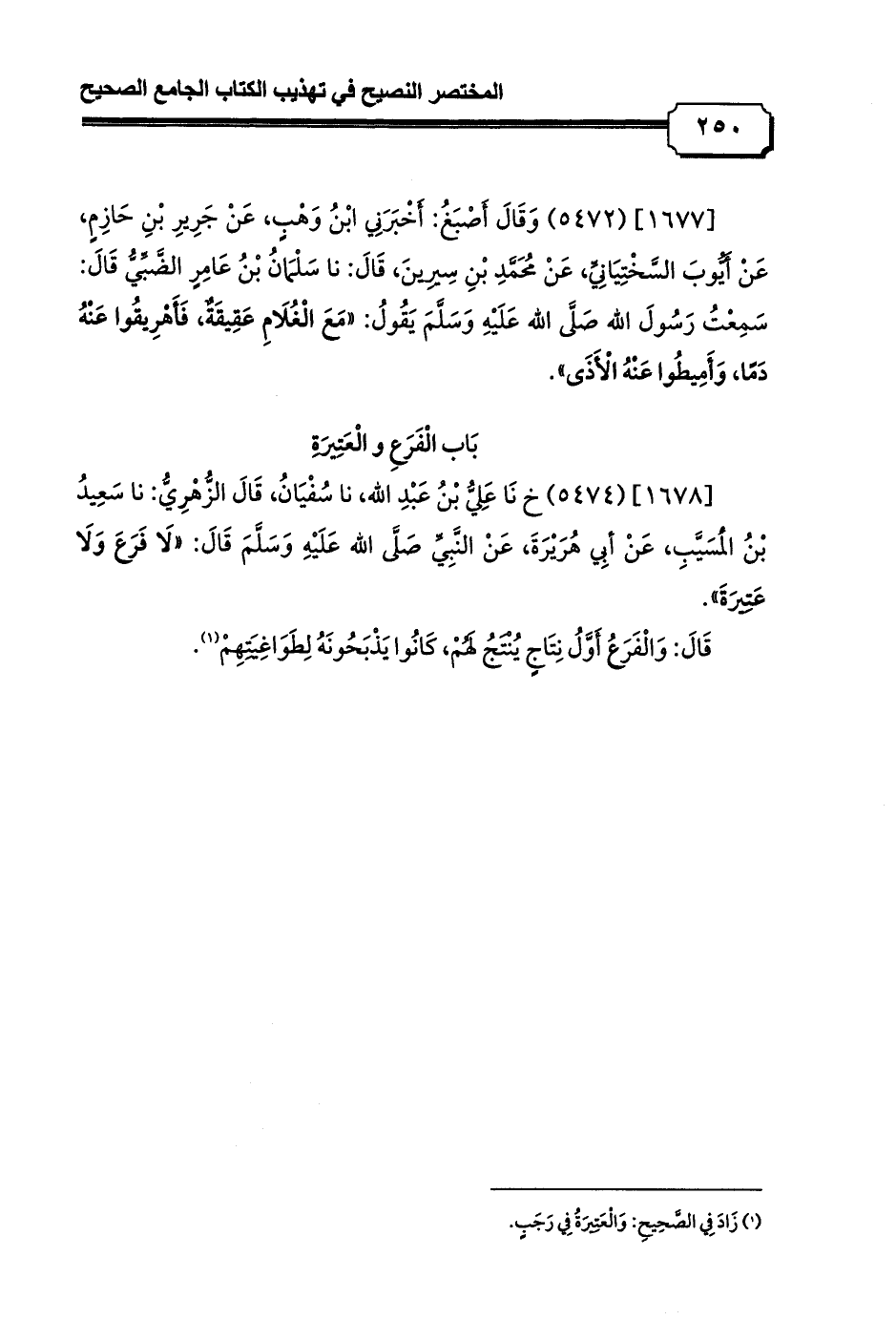 [1678] (5474) خ نَا عَلِيُّ بْنُ عَبْدِ الله، نا سُفْيَانُ، قَالَ الزُّهْرِيُّ: نا سَعِيدُ بْنُ الْمُسَيَّبِ، عَنْ أبِي هُرَيْرَةَ، عَنْ النَّبِيِّ صَلَّى الله عَلَيْهِ وَسَلَّمَ قَالَ: «لَا فَرَعَ وَلَا عَتِيرَةَ».