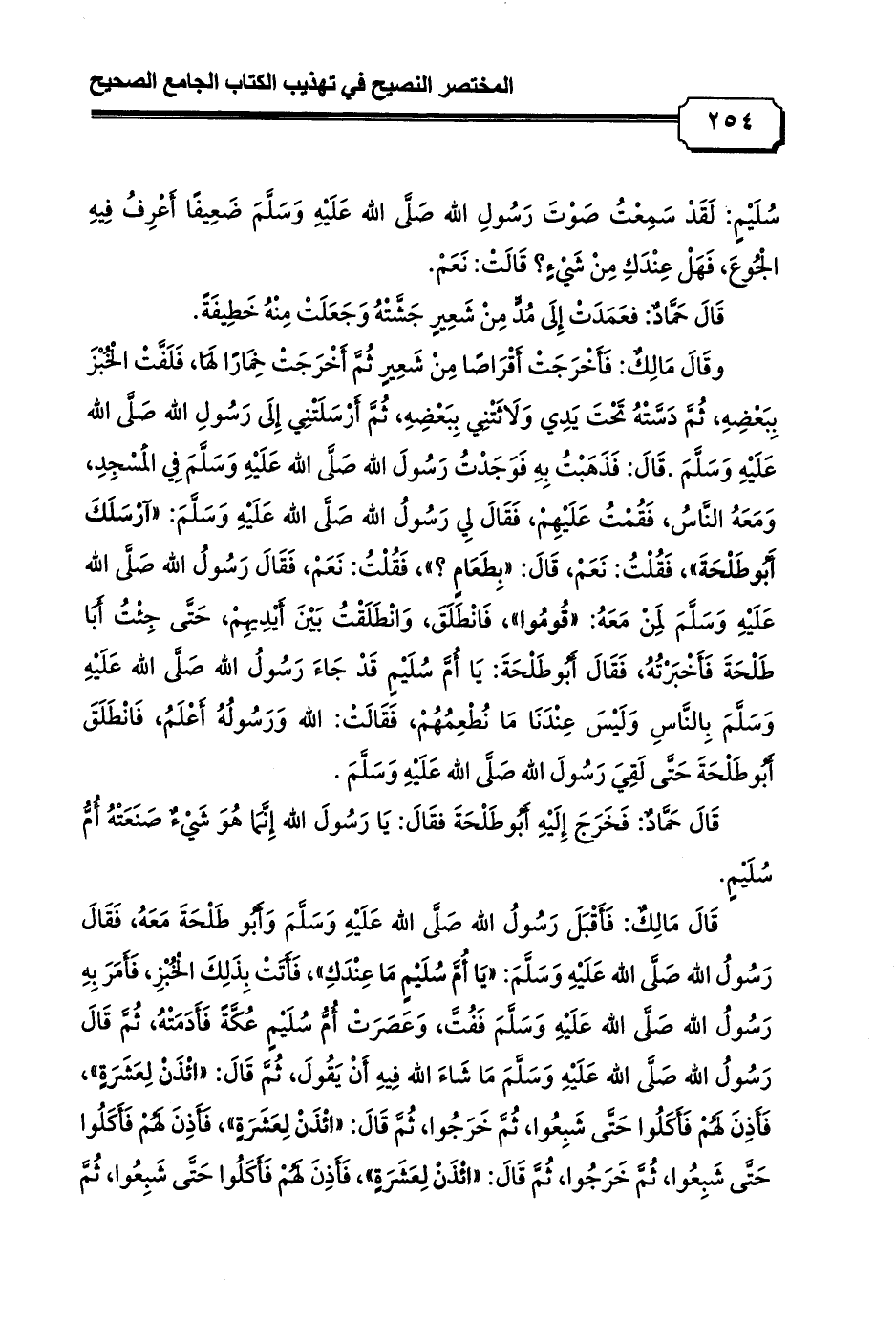 قَالَ مَالِكٌ: فَأَقْبَلَ رَسُولُ الله صَلَّى الله عَلَيْهِ وَسَلَّمَ وَأَبُو طَلْحَةَ مَعَهُ، فَقَالَ رَسُولُ الله صَلَّى الله عَلَيْهِ وَسَلَّمَ: «يَا أُمَّ سُلَيْمٍ مَا عِنْدَكِ» , فَأَتَتْ بِذَلِكَ الْخُبْزِ, فَأَمَرَ بِهِ رَسُولُ الله صَلَّى الله عَلَيْهِ وَسَلَّمَ فَفُتَّ, وَعَصَرَتْ أُمُّ سُلَيْمٍ عُكَّةً فَأَدَمَتْهُ، ثُمَّ قَالَ رَسُولُ الله صَلَّى الله عَلَيْهِ وَسَلَّمَ مَا شَاءَ الله فِيهِ أَنْ يَقُولَ، ثُمَّ قَالَ: «ائْذَنْ لِعَشَرَةٍ» , فَأَذِنَ لَهُمْ فَأَكَلُوا حَتَّى شَبِعُوا, ثُمَّ خَرَجُوا, ثُمَّ قَالَ: «ائْذَنْ لِعَشَرَةٍ» , فَأَذِنَ لَهُمْ فَأَكَلُوا حَتَّى شَبِعُوا, ثُمَّ خَرَجُوا, ثُمَّ قَالَ: «ائْذَنْ لِعَشَرَةٍ» , فَأَذِنَ لَهُمْ فَأَكَلُوا حَتَّى شَبِعُوا, ثُمَّ