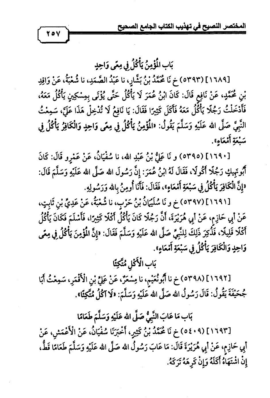 [1691] (5397) خ ونَا سُلَيْمَانُ بْنُ حَرْبٍ، نا شُعْبَةُ، عَنْ عَدِيِّ بْنِ ثَابِتٍ، عَنْ أبِي حَازِمٍ، عَنْ أبِي هُرَيْرَةَ، أَنَّ رَجُلًا كَانَ يَأْكُلُ أَكْلًا كَثِيرًا, فَأَسْلَمَ فَكَانَ يَأْكُلُ أَكْلًا قَلِيلًا، فَذُكِرَ ذَلِكَ لِلنَّبِيِّ صَلَّى الله عَلَيْهِ وَسَلَّمَ فَقَالَ: «إِنَّ الْمُؤْمِنَ يَأْكُلُ فِي مِعًى وَاحِدٍ وَالْكَافِرَ يَأْكُلُ فِي سَبْعَةِ أَمْعَاءٍ».