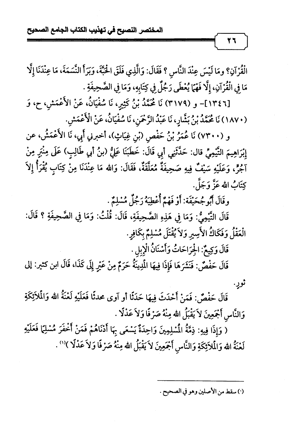 و (7300) نَا عُمَرُ بْنُ حَفْصِ (بْنِ غِيَاثٍ) , أخبرني أَبِي, نَا الأَعْمَشُ, عن إِبْرَاهِيمَ التَّيْمِيِّ قال: حَدَّثَنِي أبِي قَالَ: خَطَبَنَا عَلِيُّ (بنُ أبي طَالِبٍ) عَلَى مِنْبَرٍ مِنْ آجُرٍّ, وَعَلَيْهِ سَيْفٌ فِيهِ صَحِيفَةٌ مُعَلَّقَةٌ, فَقَالَ: وَالله مَا عِنْدَنَا مِنْ كِتَابٍ يُقْرَأُ إِلاَ كِتَابُ الله عَزَّ وَجَلَّ.