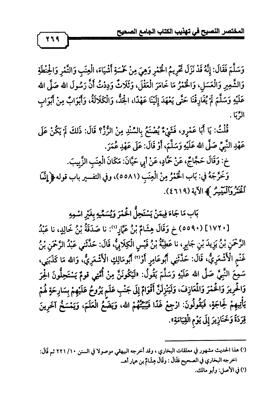 [1720] (5590) خ وَقَالَ هِشَامٌ بْنُ عَمَّارٍ (¬1): نا صَدَقَةُ بْنُ خَالِدٍ، نا عَبْدُ الرَّحْمَنِ بْنُ يَزِيدَ بْنِ جَابِرٍ، نا عَطِيَّةُ بْنُ قَيْسٍ الْكِلَابِيُّ، قَالَ: حَدَّثَني عَبْدُ الرَّحْمَنِ بْنُ غَنْمٍ الْأَشْعَرِيُّ، قَالَ: حَدَّثَنِي أَبُوعَامِرٍ أَوْ (¬2) أَبُومَالِكٍ الْأَشْعَرِيُّ، وَالله مَا كَذَبَنِي، سَمِعَ النَّبِيَّ صَلَّى الله عَلَيْهِ وَسَلَّمَ يَقُولُ: «لَيَكُونَنَّ مِنْ أُمَّتِي قومٌ يَسْتَحِلُّونَ الْحِرَ وَالْحَرِيرَ وَالْخَمْرَ وَالْمَعَازِفَ، وَلَيَنْزِلَنَّ أَقْوَامٌ إِلَى جَنْبِ عَلَمٍ يَرُوحُ عَلَيْهِمْ بِسَارِحَةٍ لَهُمْ يَأْتِيهِمْ لِحَاجَةٍ، فَيَقُولُونَ: ارْجِعْ غَدًا فَيُبَيِّتُهُمْ الله، وَيَضَعُ الْعَلَمَ، وَيَمْسَخُ آخَرِينَ قِرَدَةً وَخَنَازِيرَ إِلَى يَوْمِ الْقِيَامَةِ».