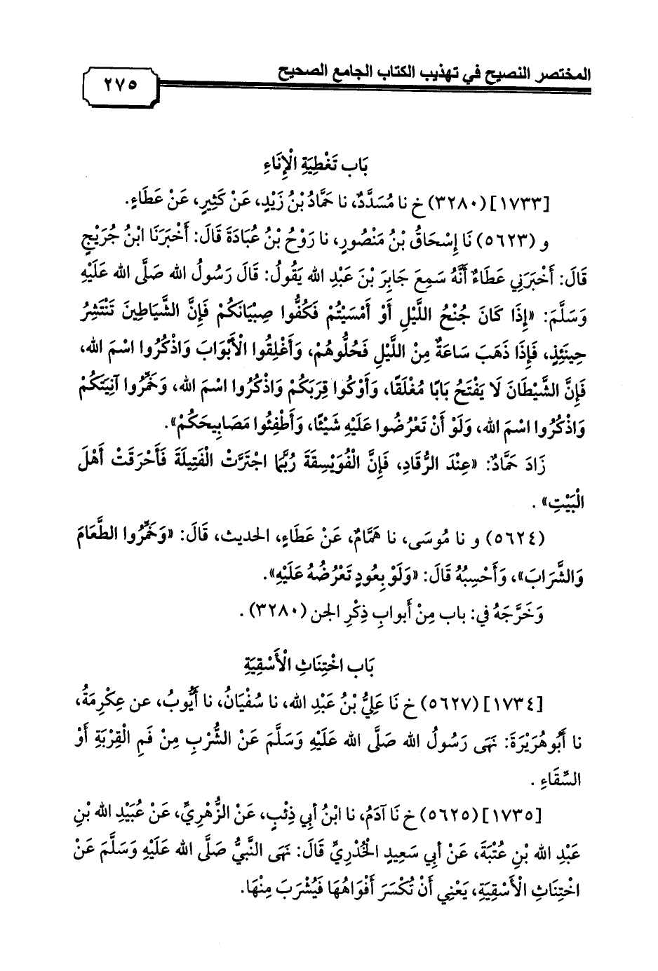 [1735] (5625) خ نَا آدَمُ، نا ابْنُ أبِي ذِئْبٍ، عَنْ الزُّهْرِيِّ، عَنْ عُبَيْدِ الله بْنِ عَبْدِ الله بْنِ عُتْبَةَ، عَنْ أبِي سَعِيدٍ الْخُدْرِيِّ قَالَ: نَهَى النَّبيُّ صَلَّى الله عَلَيْهِ وَسَلَّمَ عَنْ اخْتِنَاثِ الْأَسْقِيَةِ, يَعْنِي أَنْ تُكْسَرَ أَفْوَاهُهَا فَيُشْرَبَ مِنْهَا.