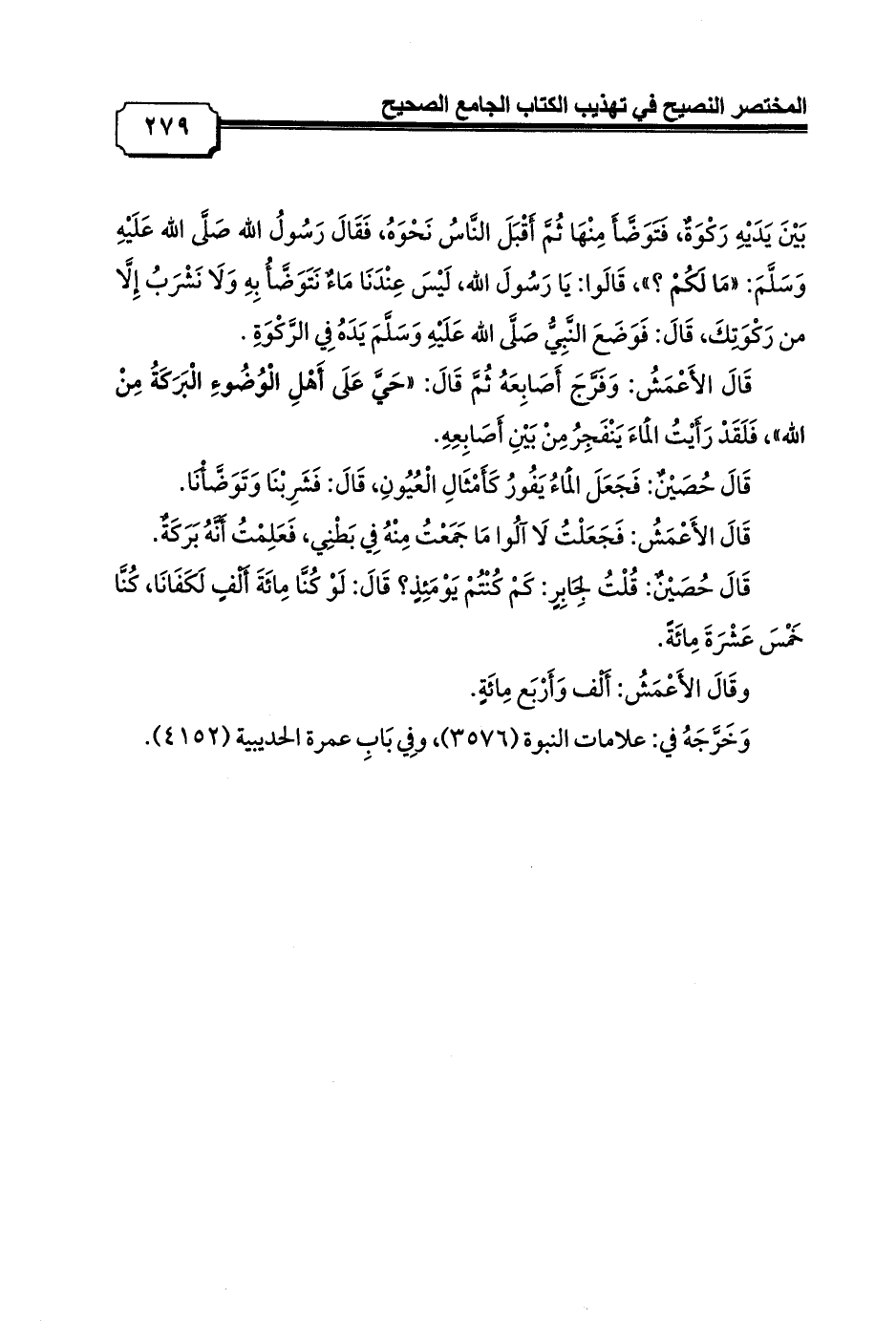 قَالَ الأَعْمَشُ: وَفَرَّجَ أَصَابِعَهُ ثُمَّ قَالَ: «حَيَّ عَلَى أَهْلِ الْوُضُوءِ الْبَرَكَةُ مِنْ الله» , فَلَقَدْ رَأَيْتُ الْمَاءَ يَنْفَجِرُ مِنْ بَيْنِ أَصَابِعِهِ.