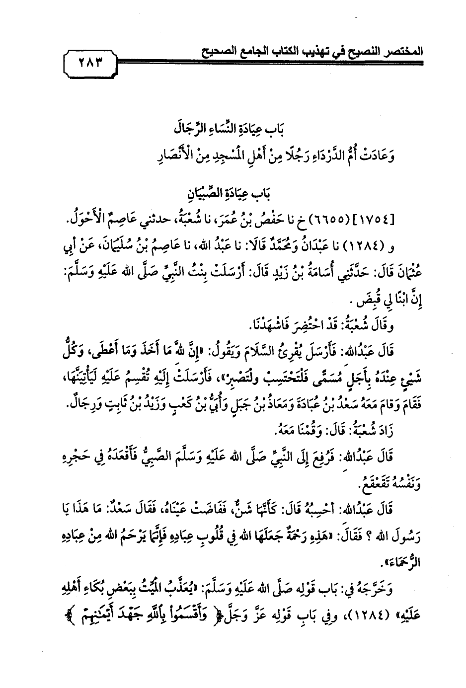 و (1284) نا عَبْدَانُ وَمُحَمَّدٌ قَالَا: نا عَبْدُ الله، نا عَاصِمُ بْنُ سُلَيْمَانَ، عَنْ أبِي عُثْمَانَ قَالَ: حَدَّثَنِي أُسَامَةُ بْنُ زَيْدٍ قَالَ: أَرْسَلَتْ بِنْتُ النَّبِيِّ صَلَّى الله عَلَيْهِ وَسَلَّمَ: إِنَّ ابْنًا لِي قُبِضَ.