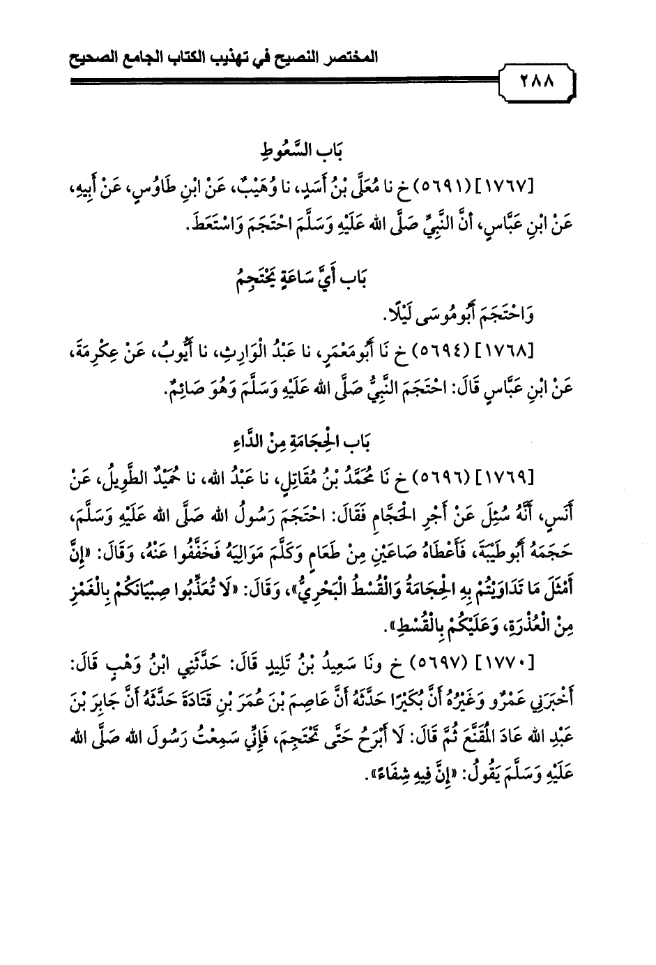 [1768] (5694) خ نَا أَبُومَعْمَرٍ، نا عَبْدُ الْوَارِثِ، نا أَيُّوبُ، عَنْ عِكْرِمَةَ، عَنْ ابْنِ عَبَّاسٍ قَالَ: احْتَجَمَ النَّبِيُّ صَلَّى الله عَلَيْهِ وَسَلَّمَ وَهُوَ صَائِمٌ.
