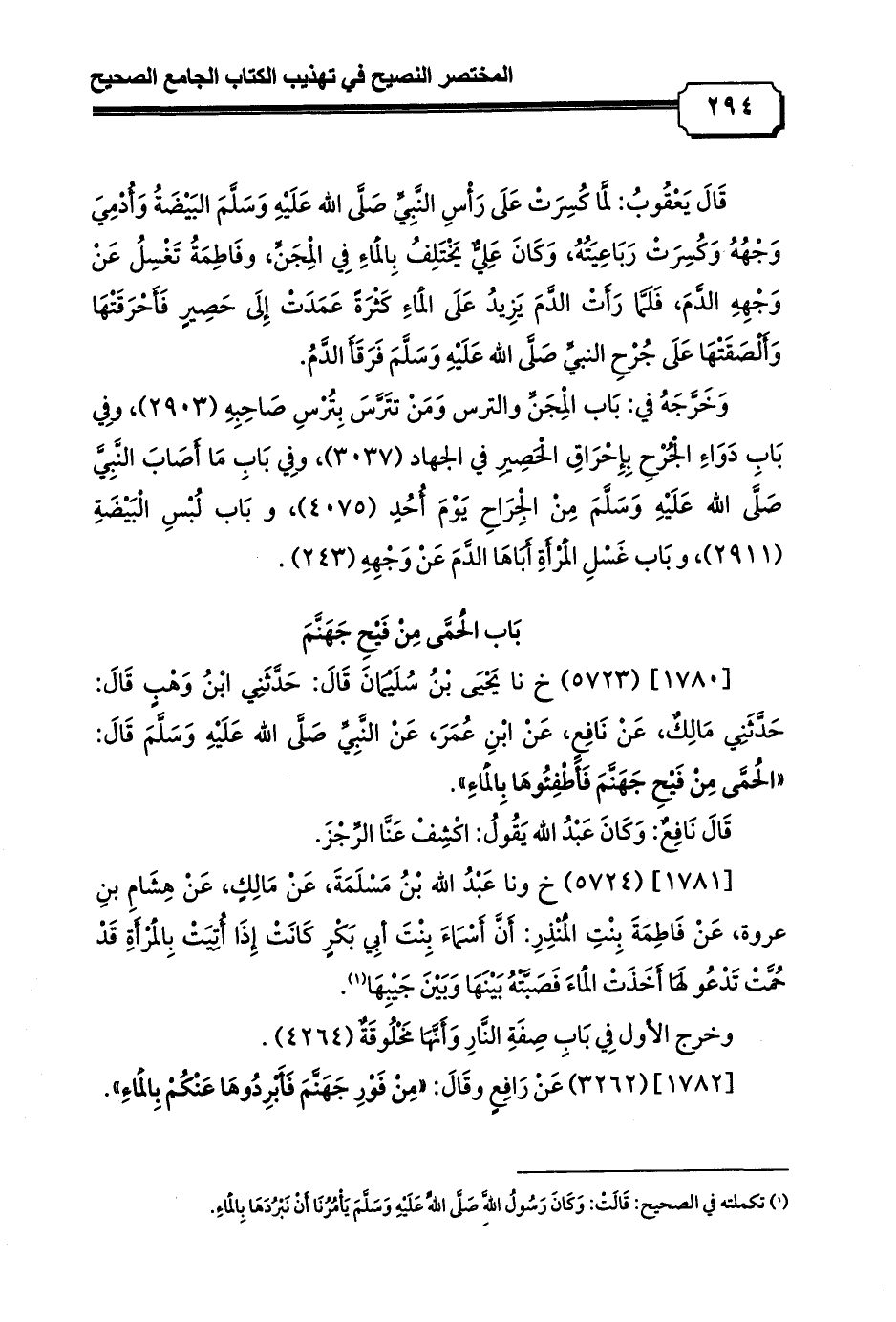 وَخَرَّجَهُ في: بَاب الْمِجَنِّ والترس وَمَنْ تتَرَّسَ بِتُرْسِ صَاحِبِهِ (2903) , وفِي بَابِ دَوَاءِ الْجُرْحِ بِإِحْرَاقِ الْحَصِيرِ في الجهاد (3037) , وفِي بَابِ مَا أَصَابَ النَّبِيَّ صَلَّى الله عَلَيْهِ وَسَلَّمَ مِنْ الْجِرَاحِ يَوْمَ أُحُدٍ (4075) , وبَاب لُبْسِ الْبَيْضَةِ (2911) , وبَاب غَسْلِ الْمَرْأَةِ أَبَاهَا الدَّمَ عَنْ وَجْهِهِ (243).