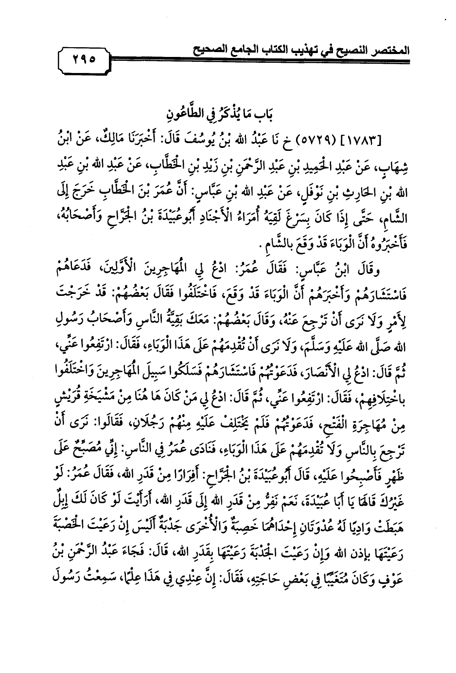 [1783] (5729) خ نَا عَبْدُ الله بْنُ يُوسُفَ قَالَ: أَخْبَرَنَا مَالِكٌ، عَنْ ابْنُ شِهَابٍ، عَنْ عَبْدِ الْحَمِيدِ بْنِ عَبْدِ الرَّحْمَنِ بْنِ زَيْدِ بْنِ الْخَطَّابِ، عَنْ عَبْدِ الله بْنِ عَبْدِ الله بْنِ الحَارِثِ بْنِ نَوْفَلٍ، عَنْ عَبْدِ الله بْنِ عَبَّاسٍ: أَنَّ عُمَرَ بْنَ الْخَطَّابِ خَرَجَ إِلَى الشَّامِ, حَتَّى إِذَا كَانَ بِسَرْغَ لَقِيَهُ أُمَرَاءُ الْأَجْنَادِ أَبُوعُبَيْدَةَ بْنُ الْجَرَّاحِ وَأَصْحَابُهُ، فَأَخْبَرُوهُ أَنَّ الْوَبَاءَ قَدْ وَقَعَ بالشَّامِ.