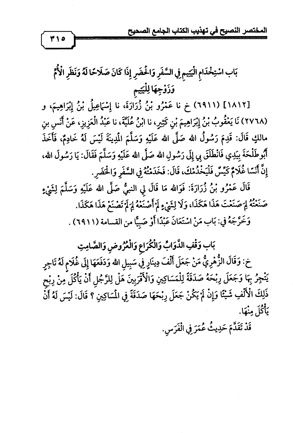 [1812] (6911) خ نا عَمْرُو بْنُ زُرَارَةَ، نا إِسْمَاعِيلُ بْنُ إِبْرَاهِيمَ, و (2768) نَا يَعْقُوبُ بْنُ إِبْرَاهِيمَ بْنِ كَثِيرٍ، نا ابْنُ عُلَيَّةَ، نا عَبْدُ الْعَزِيزِ، عَنْ أَنَسِ بنِ مالكٍ قَالَ: قَدِمَ رَسُولُ الله صَلَّى الله عَلَيْهِ وَسَلَّمَ الْمَدِينَةَ لَيْسَ لَهُ خَادِمٌ، فَأَخَذَ أَبُوطَلْحَةَ بِيَدِي فَانْطَلَقَ بِي إِلَى رَسُولِ الله صَلَّى الله عَلَيْهِ وَسَلَّمَ فَقَالَ: يَا رَسُولَ الله، إِنَّ أَنَسًا غُلَامٌ كَيِّسٌ فَلْيَخْدُمْكَ، قَالَ: فَخَدَمْتُهُ فِي السَّفَرِ وَالْحَضَرِ.