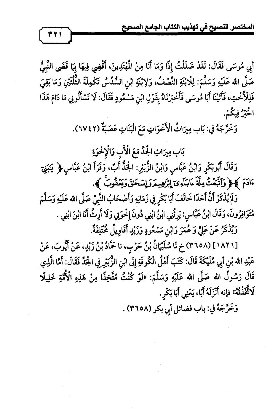 [1821] (3658) خ نَا سُلَيْمَانُ بْنُ حَرْبٍ، نا حَمَّادُ بْنُ زَيْدٍ، عَنْ أَيُّوبَ، عَنْ عَبْدِ الله بْنِ أبِي مُلَيْكَةَ قَالَ: كَتَبَ أَهْلُ الْكُوفَةِ إِلَى ابْنِ الزُّبَيْرِ فِي الْجَدِّ فَقَالَ: أَمَّا الَّذِي قَالَ رَسُولُ الله صَلَّى الله عَلَيْهِ وَسَلَّمَ: «لَوْ كُنْتُ مُتَّخِذًا مِنْ هَذِهِ الْأُمَّةِ خَلِيلًا لَاتَّخَذْتُهُ» فإنه أَنْزَلَهُ أَبًا، يَعْنِي أَبَا بَكْرٍ.