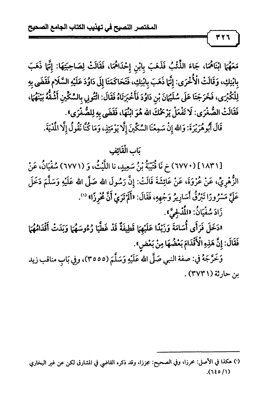 [1831] (6770) خ نَا قُتَيْبَةُ بْنُ سَعِيدٍ، نا اللَّيْثُ، وَ (6771) سُفْيَانُ، عَنْ الزُّهْرِيِّ، عَنْ عُرْوَةَ، عَنْ عَائِشَةَ قَالَتْ: إِنَّ رَسُولَ الله صَلَّى الله عَلَيْهِ وَسَلَّمَ دَخَلَ عَلَيَّ مَسْرُورًا تَبْرُقُ أَسَارِيرُ وَجْهِهِ، فَقَالَ: «أَلَمْ تَرَيْ أَنَّ مُحْرِزًا» (¬1).