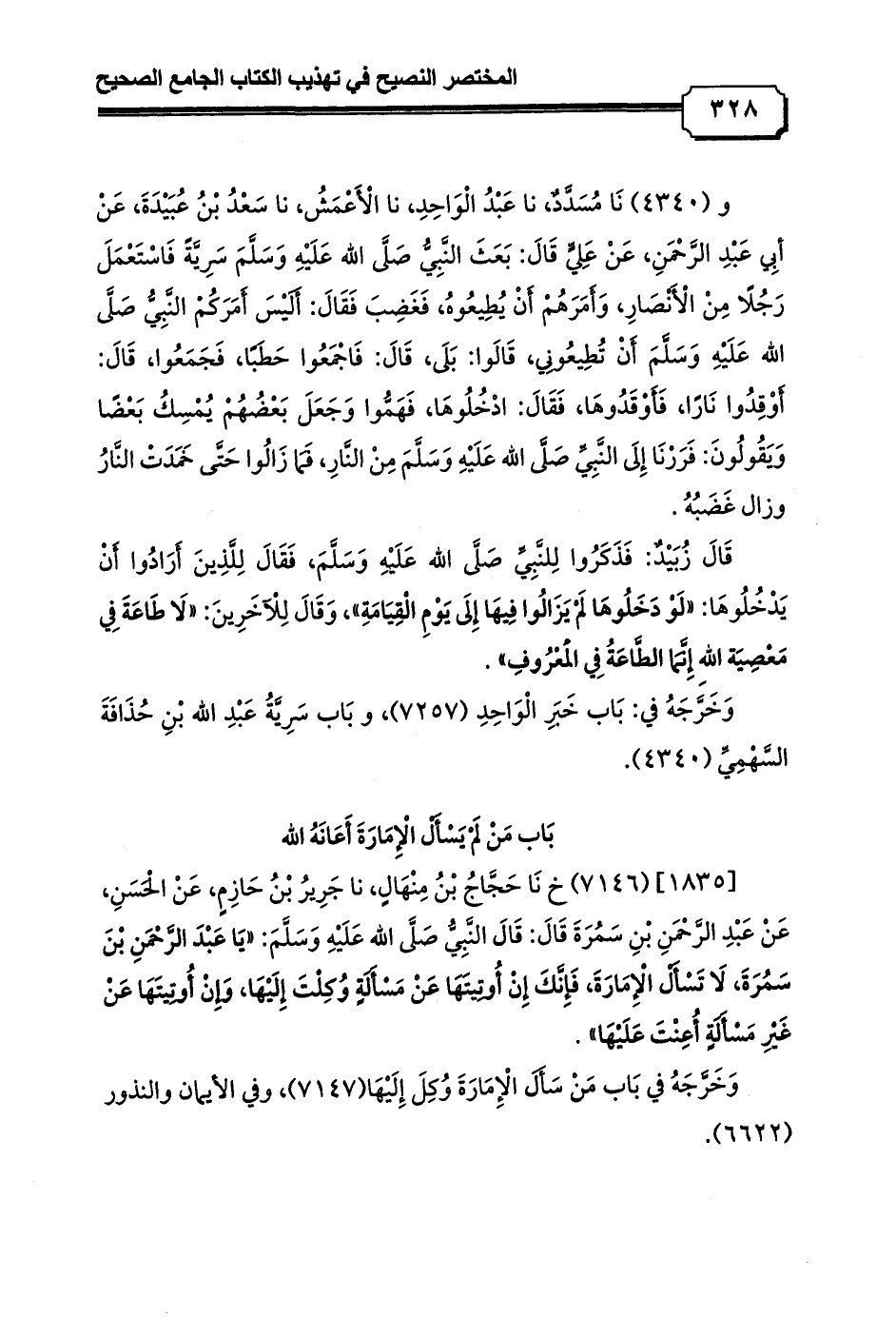و (4340) نَا مُسَدَّدٌ، نا عَبْدُ الْوَاحِدِ، نا الْأَعْمَشُ، نا سَعْدُ بْنُ عُبَيْدَةَ، عَنْ أبِي عَبْدِ الرَّحْمَنِ، عَنْ عَلِيٍّ قَالَ: بَعَثَ النَّبِيُّ صَلَّى الله عَلَيْهِ وَسَلَّمَ سَرِيَّةً فَاسْتَعْمَلَ رَجُلًا مِنْ الْأَنْصَارِ، وَأَمَرَهُمْ أَنْ يُطِيعُوهُ، فَغَضِبَ فَقَالَ: أَلَيْسَ أَمَرَكُمْ النَّبِيُّ صَلَّى الله عَلَيْهِ وَسَلَّمَ أَنْ تُطِيعُونِي، قَالَوا: بَلَى، قَالَ: فَاجْمَعُوا حَطَبًا، فَجَمَعُوا، قَالَ: أَوْقِدُوا نَارًا، فَأَوْقَدُوهَا، فَقَالَ: ادْخُلُوهَا، فَهَمُّوا وَجَعَلَ بَعْضُهُمْ يُمْسِكُ بَعْضًا وَيَقُولُونَ: فَرَرْنَا إِلَى النَّبِيِّ صَلَّى الله عَلَيْهِ وَسَلَّمَ مِنْ النَّارِ، فَمَا زَالُوا حَتَّى خَمَدَتْ النَّارُ وزال غَضَبُهُ.