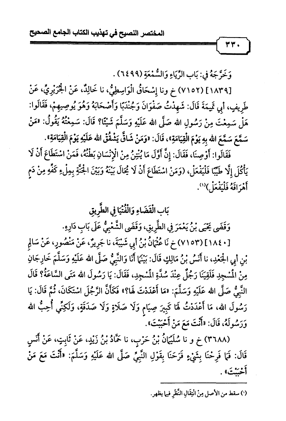 [1840] (7153) خ نَا عُثْمَانُ بْنُ أبِي شَيْبَةَ، نا جَرِيرٌ، عَنْ مَنْصُورٍ، عَنْ سَالِمِ بْنِ أبِي الْجَعْدِ، نا أَنَسُ بْنُ مَالِكٍ قَالَ: بَيْنَمَا أَنَا وَالنَّبِيُّ صَلَّى الله عَلَيْهِ وَسَلَّمَ خَارِجَانِ مِنْ الْمَسْجِدِ فَلَقِيَنَا رَجُلٌ عِنْدَ سُدَّةِ الْمَسْجِدِ، فَقَالَ: يَا رَسُولَ الله مَتَى السَّاعَةُ؟ قَالَ النَّبِيُّ صَلَّى الله عَلَيْهِ وَسَلَّمَ: «مَا أَعْدَدْتَ لَهَا؟» فَكَأَنَّ الرَّجُلَ اسْتَكَانَ، ثُمَّ قَالَ: يَا رَسُولَ الله، مَا أَعْدَدْتُ لَهَا كَبِيرَ صِيَامٍ وَلَا صَلَاةٍ وَلَا صَدَقَةٍ، وَلَكِنِّي أُحِبُّ الله وَرَسُولَهُ, قَالَ: «أَنْتَ مَعَ مَنْ أَحْبَبْتَ».