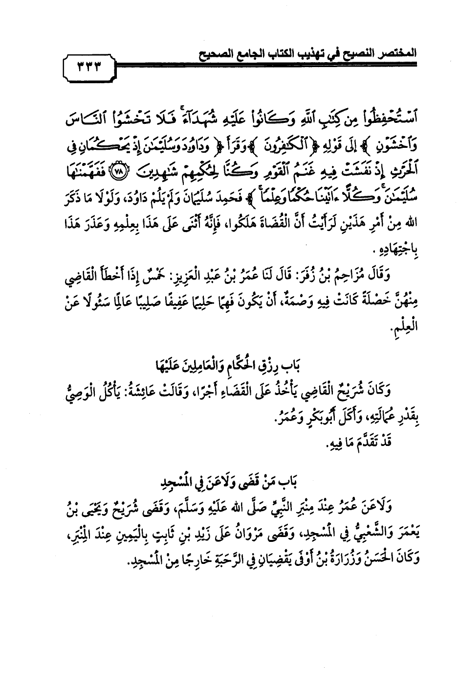 اسْتُحْفِظُوا مِنْ كِتَابِ اللَّهِ وَكَانُوا عَلَيْهِ شُهَدَاءَ فَلَا تَخْشَوُا النَّاسَ وَاخْشَوْنِ} إلَى قَوْلِهِ {الْكَافِرُونَ} وَقَرَأَ {وَدَاوُودَ وَسُلَيْمَانَ إِذْ يَحْكُمَانِ فِي الْحَرْثِ إِذْ نَفَشَتْ فِيهِ غَنَمُ الْقَوْمِ وَكُنَّا لِحُكْمِهِمْ شَاهِدِينَ (78) فَفَهَّمْنَاهَا سُلَيْمَانَ وَكُلًّا آتَيْنَا حُكْمًا وَعِلْمًا} فَحَمِدَ سُلَيْمَانَ وَلَمْ يَلُمْ دَاوُدَ، وَلَوْلَا مَا ذَكَرَ الله مِنْ أَمْرِ هَذَيْنِ لَرَأَيْتُ أَنَّ الْقُضَاةَ هَلَكُوا، فَإِنَّهُ أَثْنَى عَلَى هَذَا بِعِلْمِهِ وَعَذَرَ هَذَا بِاجْتِهَادِهِ.