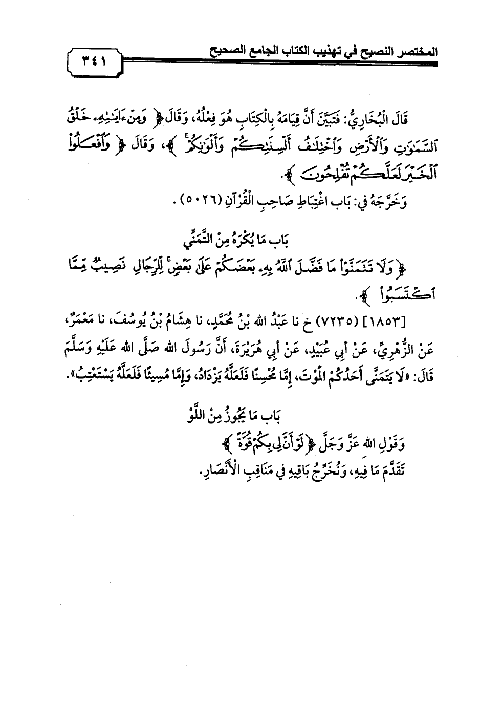 [1853] (7235) خ نا عَبْدُ الله بْنُ مُحَمَّدٍ، نا هِشَامُ بْنُ يُوسُفَ، نا مَعْمَرٌ، عَنْ الزُّهْرِيِّ، عَنْ أبِي عُبَيْدٍ، عَنْ أبِي هُرَيْرَةَ، أَنَّ رَسُولَ الله صَلَّى الله عَلَيْهِ وَسَلَّمَ قَالَ: «لَا يَتَمَنَّى أَحَدُكُمْ الْمَوْتَ، إِمَّا مُحْسِنًا فَلَعَلَّهُ يَزْدَادُ، وَإِمَّا مُسِيئًا فَلَعَلَّهُ يَسْتَعْتِبُ».