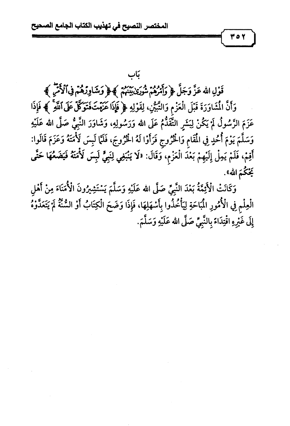 وَكَانَتْ الْأَئِمَّةُ بَعْدَ النَّبِيِّ صَلَّى الله عَلَيْهِ وَسَلَّمَ يَسْتَشِيرُونَ الْأُمَنَاءَ مِنْ أَهْلِ الْعِلْمِ فِي الْأُمُورِ الْمُبَاحَةِ لِيَأْخُذُوا بِأَسْهَلِهَا، فَإِذَا وَضَحَ الْكِتَابُ أَوْ السُّنَّةُ لَمْ يَتَعَدَّوْهُ إِلَى غَيْرِهِ اقْتِدَاءً بِالنَّبِيِّ صَلَّى الله عَلَيْهِ وَسَلَّمَ.