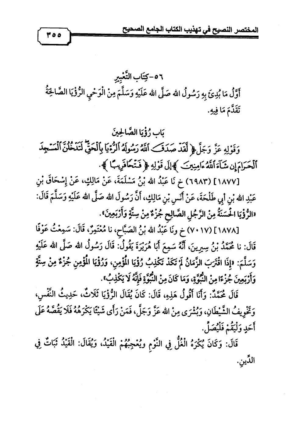 [1878] (7017) خ ونَا عَبْدُ الله بْنُ الصَبَّاحِ, نا مُعْتَمِرٌ, قَالَ: سَمِعْتُ عَوْفًا قَالَ: نا مُحَمَّدُ بْنُ سِيرِينَ, أَنَّهُ سَمِعَ أَبَا هُرَيْرَةَ يَقُولُ: قَالَ رَسُولُ الله صَلَّى الله عَلَيْهِ وَسَلَّمَ: «إِذَا اقْتَرَبَ الزَّمَانُ لَمْ تَكَدْ تَكْذِبُ رُؤْيَا الْمُؤْمِنِ، وَرُؤْيَا الْمُؤْمِنِ جُزْءٌ مِنْ سِتَّةٍ وَأَرْبَعِينَ جُزْءًا مِنْ النُّبُوَّةِ، وَمَا كَانَ مِنْ النُّبُوَّةِ فَإِنَّهُ لَا يَكْذِبُ».