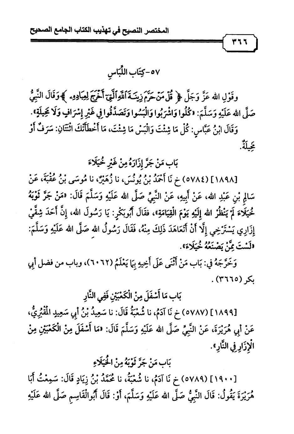 [1898] (5784) خ نَا أَحْمَدُ بْنُ يُونُسَ, نا زُهَيْرٌ, نا مُوسَى بْنُ عُقْبَةَ, عَنْ سَالِمِ بْنِ عَبْدِ الله, عَنْ أَبِيهِ, عَنْ النَّبِيِّ صَلَّى الله عَلَيْهِ وَسَلَّمَ قَالَ: «مَنْ جَرَّ ثَوْبَهُ خُيَلَاءَ لَمْ يَنْظُرْ الله إِلَيْهِ يَوْمَ الْقِيَامَةِ» , فقَالَ أَبُوبَكْرٍ: يَا رَسُولَ الله، إِنَّ أَحَدَ شِقَّيْ إِزَارِي يَسْتَرْخِي إِلَّا أَنْ أَتَعَاهَدَ ذَلِكَ مِنْهُ, فَقَالَ رَسُولُ اللهِ صَلَّى الله عَلَيْهِ وَسَلَّمَ: «لَسْتَ مِمَّنْ يَصْنَعُهُ خُيَلَاءَ».