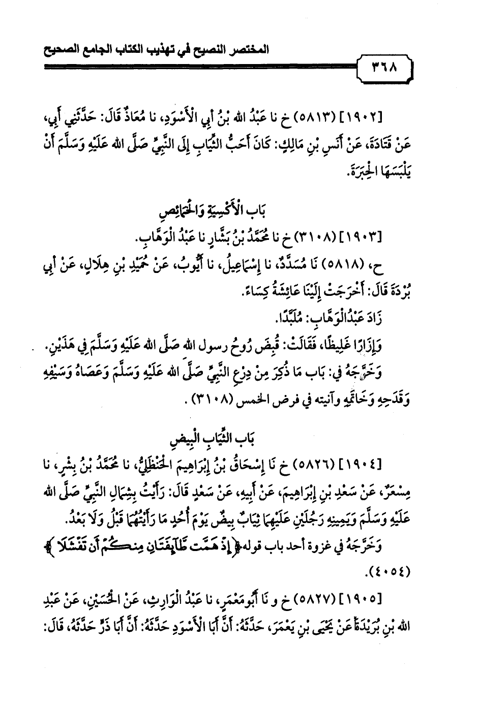 [1902] (5813) خ نا عَبْدُ الله بْنُ أبِي الْأَسْوَدِ, نا مُعَاذٌ قَالَ: حَدَّثَنِي أَبِي, عَنْ قَتَادَةَ, عَنْ أَنَسِ بْنِ مَالِكٍ: كَانَ أَحَبُّ الثِّيَابِ إِلَى النَّبِيِّ صَلَّى الله عَلَيْهِ وَسَلَّمَ أَنْ يَلْبَسَهَا الْحِبَرَةَ.