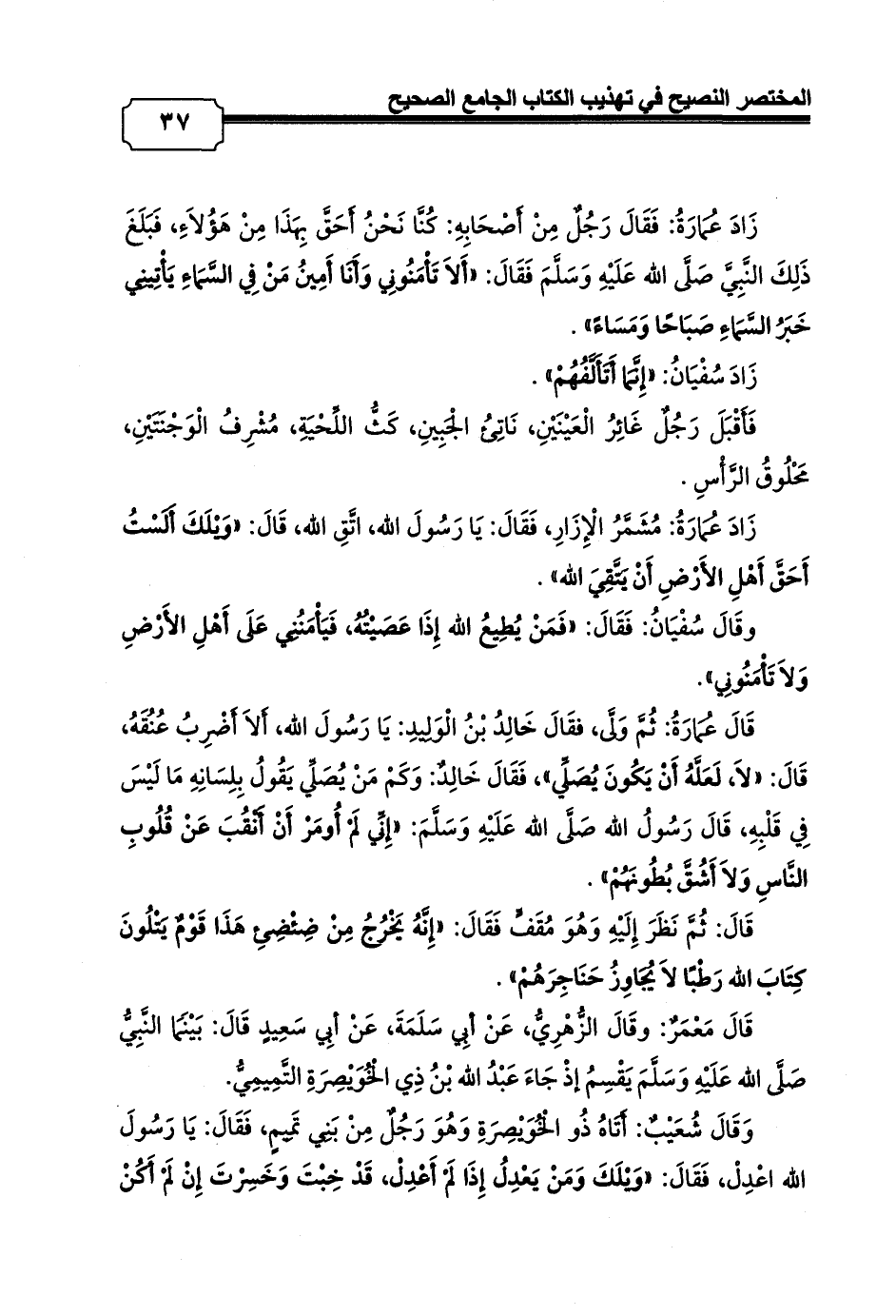 زَادَ عُمَارَةُ: مُشَمَّرُ الْإِزَارِ، فَقَالَ: يَا رَسُولَ الله, اتَّقِ الله, قَالَ: «وَيْلَكَ أَلَسْتُ أَحَقَّ أَهْلِ الأَرْضِ أَنْ يَتَّقِيَ الله».