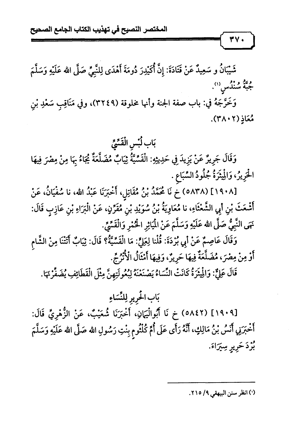 [1909] (5842) خ نَا أَبُوالْيَمَانِ, أَخْبَرَنَا شُعَيْبٌ, عَنْ الزُّهْرِيِّ قَالَ: أَخْبَرَنِي أَنَسُ بْنُ مَالِكٍ, أَنَّهُ رَأَى عَلَى أُمِّ كُلْثُومٍ بِنْتِ رَسُولِ الله صَلَّى الله عَلَيْهِ وَسَلَّمَ بُرْدَ حَرِيرٍ سِيَرَاءَ.