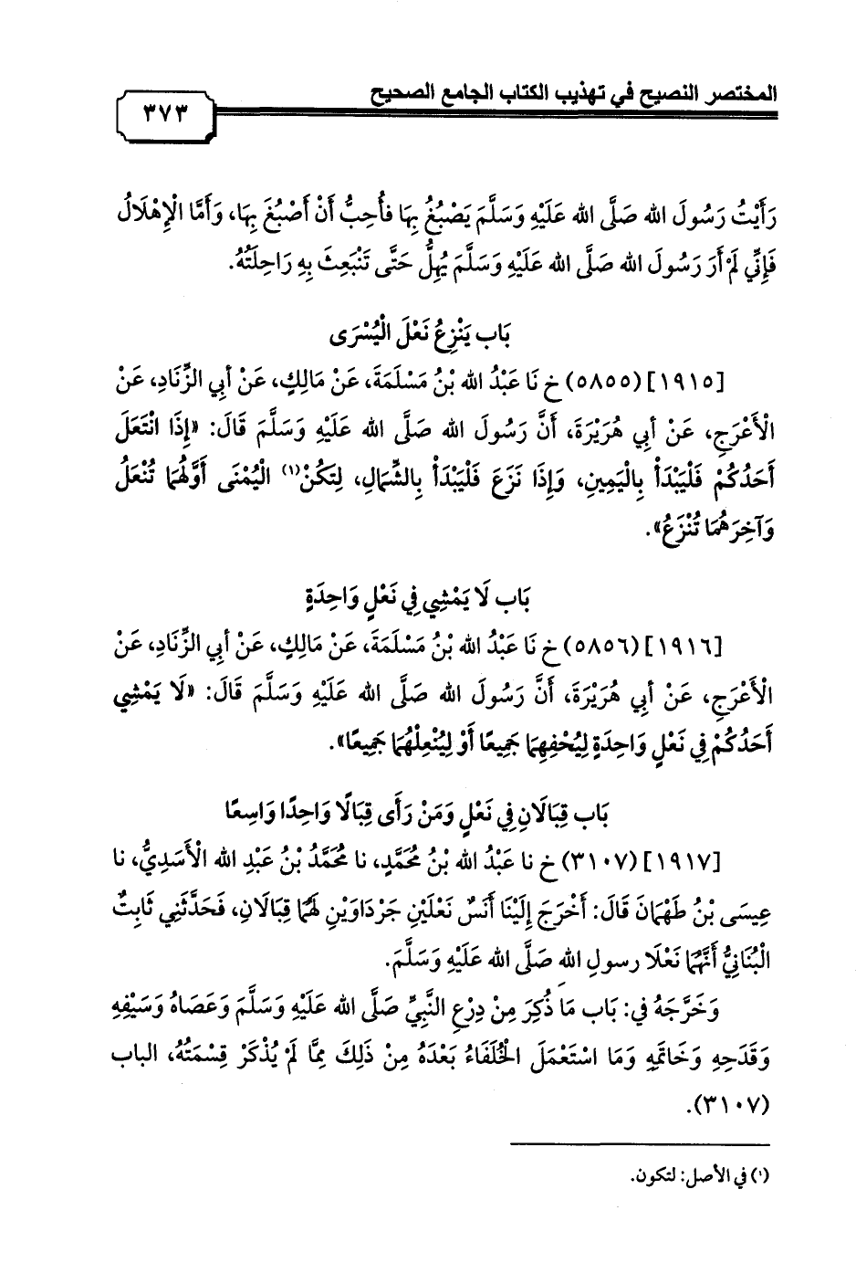 [1915] (5855) خ نَا عَبْدُ الله بْنُ مَسْلَمَةَ, عَنْ مَالِكٍ, عَنْ أبِي الزِّنَادِ, عَنْ الْأَعْرَجِ, عَنْ أبِي هُرَيْرَةَ, أَنَّ رَسُولَ الله صَلَّى الله عَلَيْهِ وَسَلَّمَ قَالَ: «إِذَا انْتَعَلَ أَحَدُكُمْ فَلْيَبْدَأْ بِالْيَمِينِ، وَإِذَا نَزَعَ فَلْيَبْدَأْ بِالشِّمَالِ، لِتَكُنْ (¬1) الْيُمْنَى أَوَّلَهُمَا تُنْعَلُ وَآخِرَهُمَا تُنْزَعُ».