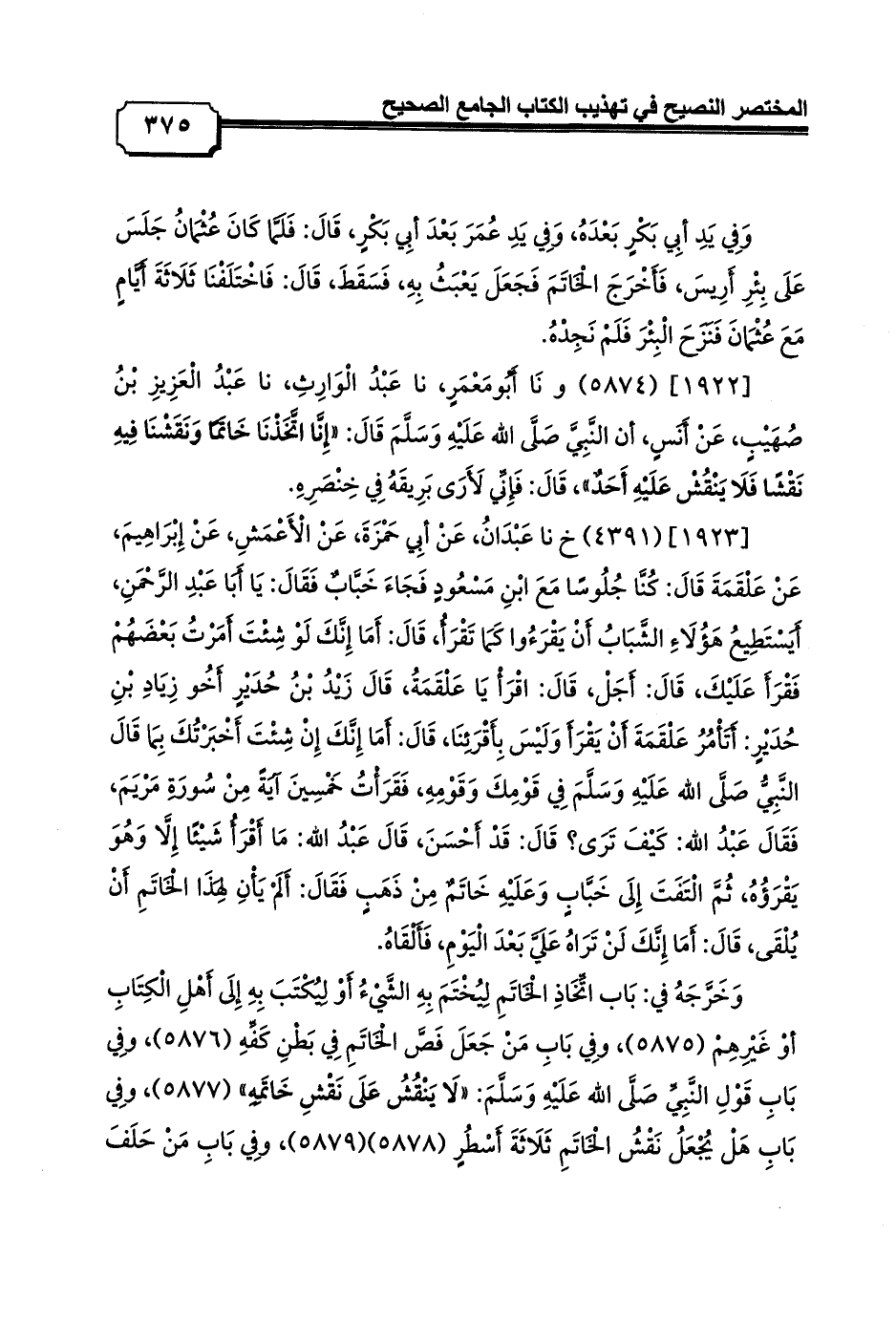 [1922] (5874) ونَا أَبُومَعْمَرٍ, نا عَبْدُ الْوَارِثِ, نا عَبْدُ الْعَزِيزِ بْنُ صُهَيْبٍ, عَنْ أَنَسٍ, أن النَّبِيَّ صَلَّى الله عَلَيْهِ وَسَلَّمَ قَالَ: «إِنَّا اتَّخَذْنَا خَاتَمًا وَنَقَشْنَا فِيهِ نَقْشًا فَلَا يَنْقُشْ عَلَيْهِ أَحَدٌ» , قَالَ: فَإِنِّي لَأَرَى بَرِيقَهُ فِي خِنْصَرِهِ.