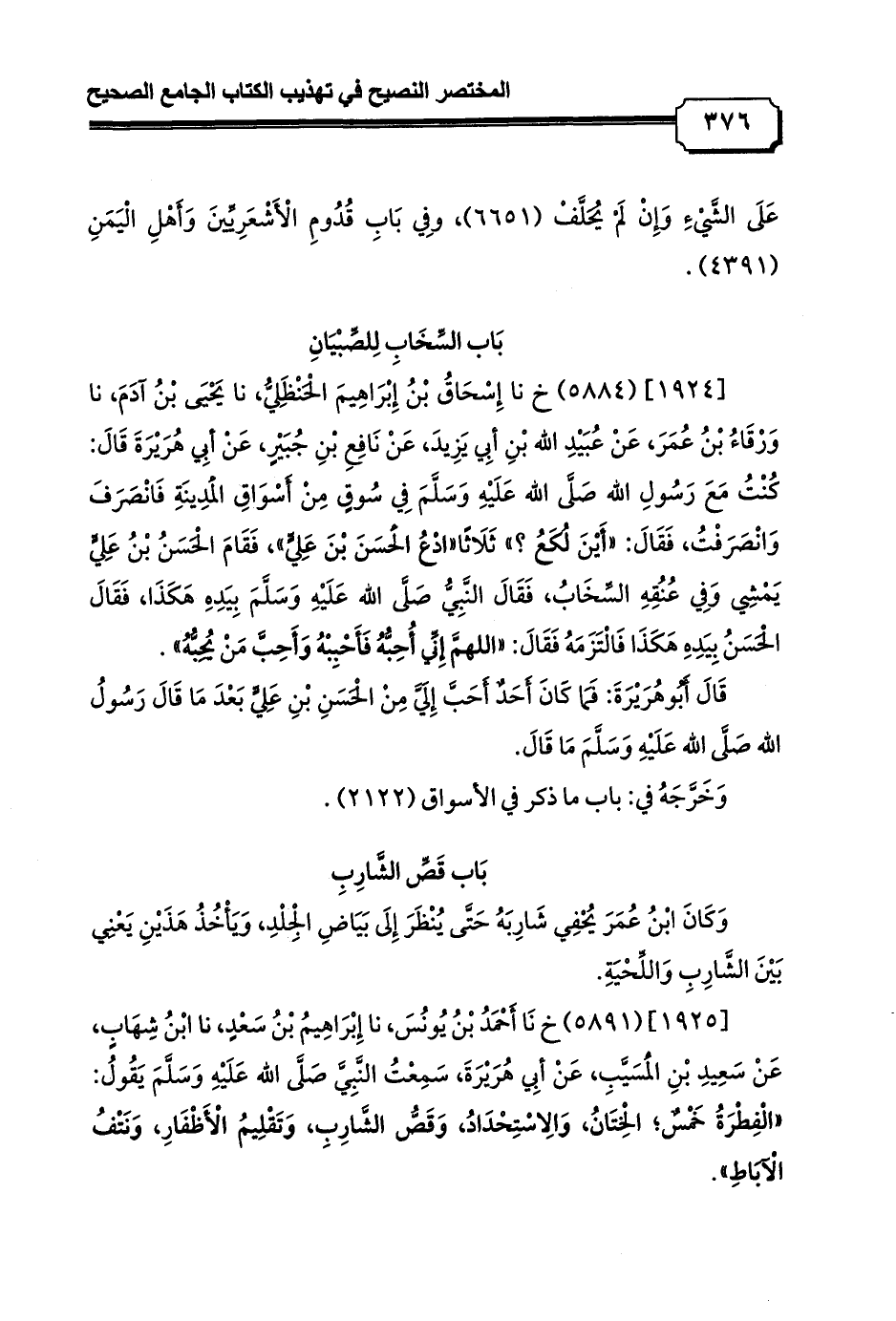 [1924] (5884) خ نا إِسْحَاقُ بْنُ إِبْرَاهِيمَ الْحَنْظَلِيُّ, نا يَحْيَى بْنُ آدَمَ, نا وَرْقَاءُ بْنُ عُمَرَ, عَنْ عُبَيْدِ الله بْنِ أبِي يَزِيدَ, عَنْ نَافِعِ بْنِ جُبَيْرٍ، عَنْ أبِي هُرَيْرَةَ قَالَ: كُنْتُ مَعَ رَسُولِ الله صَلَّى الله عَلَيْهِ وَسَلَّمَ فِي سُوقٍ مِنْ أَسْوَاقِ الْمَدِينَةِ فَانْصَرَفَ وَانْصَرَفْتُ، فَقَالَ: «أَيْنَ لُكَعُ؟» ثَلَاثًا «ادْعُ الْحَسَنَ بْنَ عَلِيٍّ» , فَقَامَ الْحَسَنُ بْنُ عَلِيٍّ يَمْشِي وَفِي عُنُقِهِ السِّخَابُ، فَقَالَ النَّبِيُّ صَلَّى الله عَلَيْهِ وَسَلَّمَ بِيَدِهِ هَكَذَا، فَقَالَ الْحَسَنُ بِيَدِهِ هَكَذَا فَالْتَزَمَهُ فَقَالَ: «اللهمَّ إِنِّي أُحِبُّهُ فَأَحْبِبْهُ وَأَحِبَّ مَنْ يُحِبُّهُ».