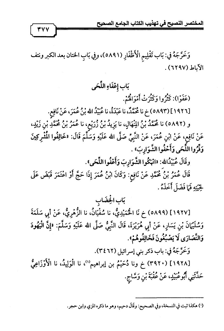 [1927] (5899) خ نَا الْحُمَيْدِيُّ, نا سُفْيَانُ, نا الزُّهْرِيُّ, عَنْ أبِي سَلَمَةَ وَسُلَيْمَانَ بْنِ يَسَارٍ, عَنْ أبِي هُرَيْرَةَ, قَالَ النَّبِيُّ صَلَّى الله عَلَيْهِ وَسَلَّمَ: «إِنَّ الْيَهُودَ وَالنَّصَارَى لَا يَصْبُغُونَ فَخَالِفُوهُمْ».