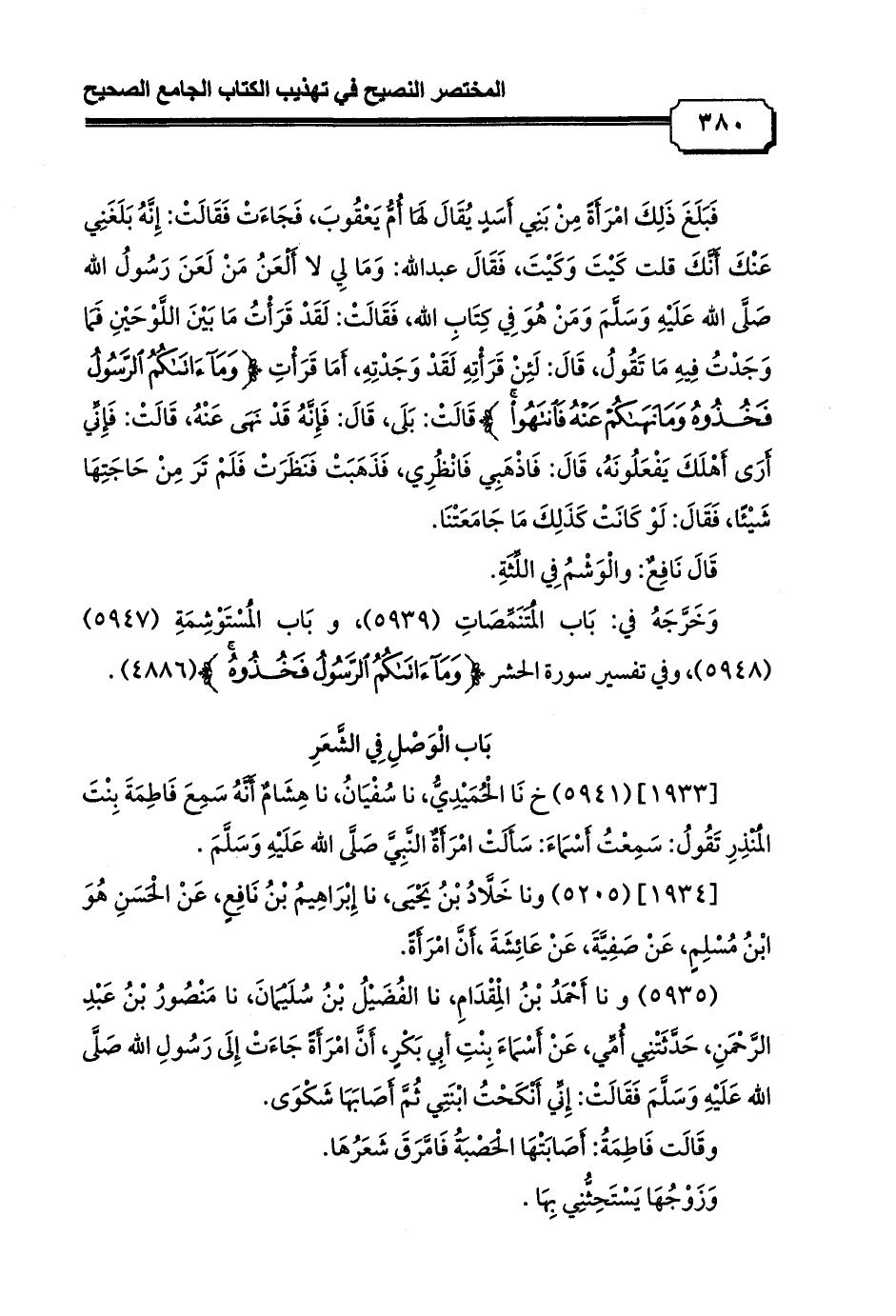 فَبَلَغَ ذَلِكَ امْرَأَةً مِنْ بَنِي أَسَدٍ يُقَالَ لَهَا أُمُّ يَعْقُوبَ، فَجَاءَتْ فَقَالَتْ: إِنَّهُ بَلَغَنِي عَنْكَ أَنَّكَ قلت كَيْتَ وَكَيْتَ، فَقَالَ عبد الله: وَمَا لِي لا أَلْعَنُ مَنْ لَعَنَ رَسُولُ الله صَلَّى الله عَلَيْهِ وَسَلَّمَ وَمَنْ هُوَ فِي كِتَابِ الله، فَقَالَتْ: لَقَدْ قَرَأْتُ مَا بَيْنَ اللَّوْحَيْنِ فَمَا وَجَدْتُ فِيهِ مَا تَقُولُ، قَالَ: لَئِنْ قَرَأْتِهِ لَقَدْ وَجَدْتِهِ، أَمَا قَرَأْتِ {وَمَا آتَاكُمُ الرَّسُولُ فَخُذُوهُ وَمَا نَهَاكُمْ عَنْهُ فَانْتَهُوا} قَالَتْ: بَلَى، قَالَ: فَإِنَّهُ قَدْ نَهَى عَنْهُ، قَالَتْ: فَإِنِّي أَرَى أَهْلَكَ يَفْعَلُونَهُ، قَالَ: فَاذْهَبِي فَانْظُرِي، فَذَهَبَتْ فَنَظَرَتْ فَلَمْ تَرَ مِنْ حَاجَتِهَا شَيْئًا، فَقَالَ: لَوْ كَانَتْ كَذَلِكَ مَا جَامَعَتْنَا.