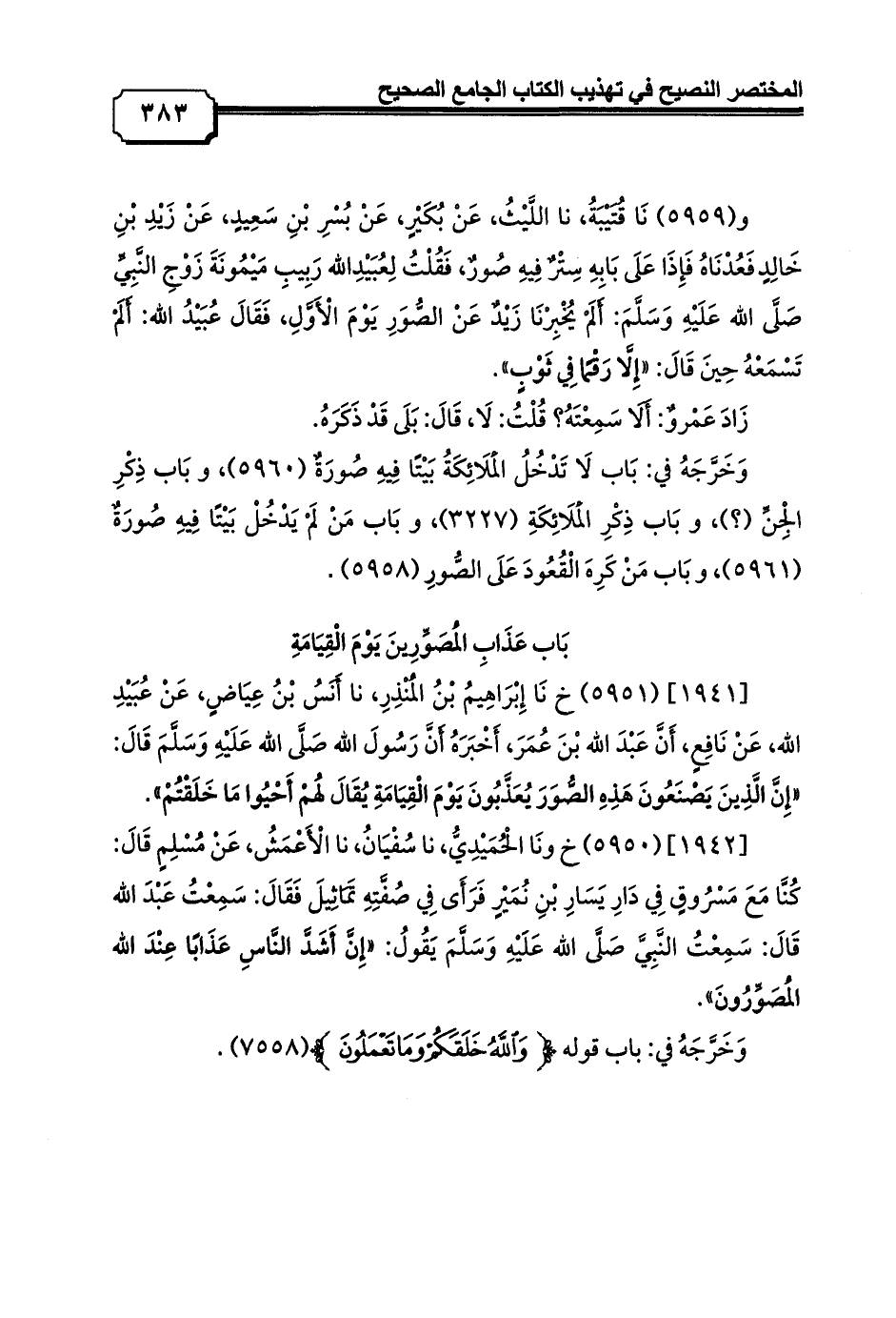 [1941] (5951) خ نَا إِبْرَاهِيمُ بْنُ الْمُنْذِرِ, نا أَنَسُ بْنُ عِيَاضٍ, عَنْ عُبَيْدِ الله, عَنْ نَافِعٍ, أَنَّ عَبْدَ الله بْنَ عُمَرَ, أَخْبَرَهُ أَنَّ رَسُولَ الله صَلَّى الله عَلَيْهِ وَسَلَّمَ قَالَ: «إِنَّ الَّذِينَ يَصْنَعُونَ هَذِهِ الصُّوَرَ يُعَذَّبُونَ يَوْمَ الْقِيَامَةِ يُقَالَ لَهُمْ أَحْيُوا مَا خَلَقْتُمْ».