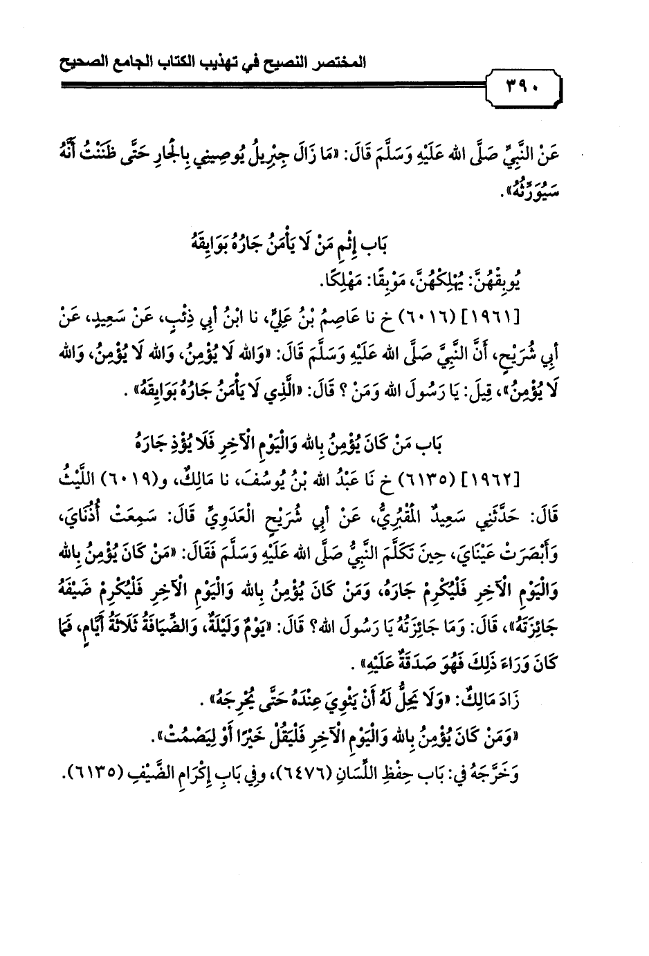[1961] (6016) خ نا عَاصِمُ بْنُ عَلِيٍّ, نا ابْنُ أبِي ذِئْبٍ, عَنْ سَعِيدٍ, عَنْ أبِي شُرَيْحٍ, أَنَّ النَّبِيَّ صَلَّى الله عَلَيْهِ وَسَلَّمَ قَالَ: «وَالله لَا يُؤْمِنُ، وَالله لَا يُؤْمِنُ، وَالله لَا يُؤْمِنُ» , قِيلَ: يَا رَسُولَ الله وَمَنْ؟ قَالَ: «الَّذِي لَا يَأْمَنُ جَارُهُ بَوَايِقَهُ».