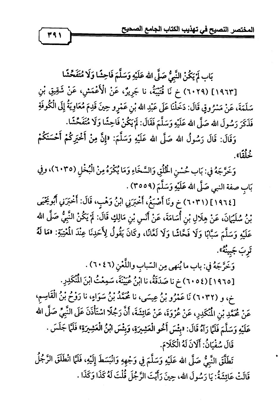 [1963] (6029) خ نَا قُتَيْبَةُ, نا جَرِيرٌ, عَنْ الْأَعْمَشِ, عَنْ شَقِيقِ بْنِ سَلَمَةَ, عَنْ مَسْرُوقٍ قَالَ: دَخَلْنَا عَلَى عَبْدِ الله بْنِ عَمْرٍو حِينَ قَدِمَ مُعَاوِيَةُ إِلَى الْكُوفَةِ فَذَكَرَ رَسُولَ الله صَلَّى الله عَلَيْهِ وَسَلَّمَ فَقَالَ: لَمْ يَكُنْ فَاحِشًا وَلَا مُتَفَحِّشًا.