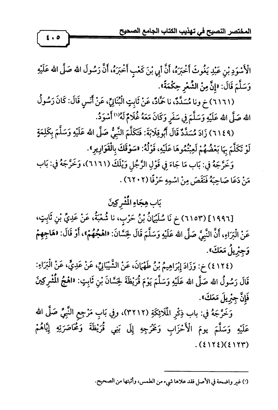 [1996] (6153) خ نَا سُلَيْمَانُ بْنُ حَرْبٍ, نا شُعْبَةُ, عَنْ عَدِيِّ بْنِ ثَابِتٍ, عَنْ الْبَرَاءِ, أَنَّ النَّبِيَّ صَلَّى الله عَلَيْهِ وَسَلَّمَ قَالَ لِحَسَّانَ: «اهْجُهُمْ» , أَوْ قَالَ: «هَاجِهِمْ وَجِبْرِيلُ مَعَكَ».