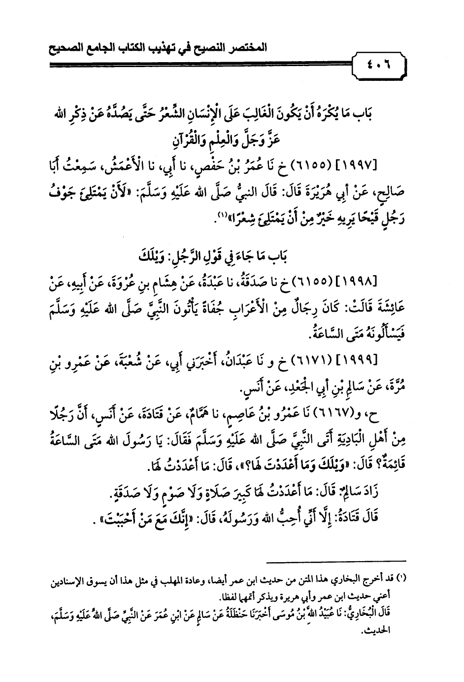 ح، و (6167) نَا عَمْرُو بْنُ عَاصِمٍ, نا هَمَّامٌ, عَنْ قَتَادَةَ, عَنْ أَنَسٍ, أَنَّ رَجُلًا مِنْ أَهْلِ الْبَادِيَةِ أَتَى النَّبِيَّ صَلَّى الله عَلَيْهِ وَسَلَّمَ فَقَالَ: يَا رَسُولَ الله مَتَى السَّاعَةُ قَائِمَةٌ؟ قَالَ: «وَيْلَكَ وَمَا أَعْدَدْتَ لَهَا؟» , قَالَ: مَا أَعْدَدْتُ لَهَا.