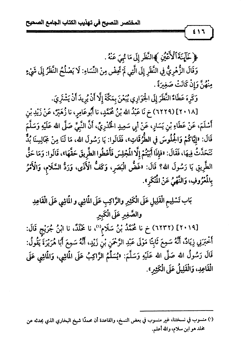 [2018] (6229) خ نَا عَبْدُ الله بْنُ مُحَمَّدٍ, نا أَبُوعَامِرٍ, نا زُهَيْرٌ, عَنْ زَيْدِ بْنِ أَسْلَمَ, عَنْ عَطَاءِ بْنِ يَسَارٍ, عَنْ أبِي سَعِيدٍ الْخُدْرِيِّ, أَنَّ النَّبِيَّ صَلَّى الله عَلَيْهِ وَسَلَّمَ قَالَ: «إِيَّاكُمْ وَالْجُلُوسَ في الطُّرُقَاتِ»، فَقَالَوا: يَا رَسُولَ الله، مَا لَنَا مِنْ مَجَالِسِنَا بُدٌّ نَتَحَدَّثُ فِيهَا، فَقَالَ: «فإِذَا أَبَيْتُمْ إِلَّا الْمَجْلِسَ فَأَعْطُوا الطَّرِيقَ حَقَّهَا» , قَالَوا: وَمَا حَقُّ الطَّرِيقِ يَا رَسُولَ الله؟ قَالَ: «غَضُّ الْبَصَرِ، وَكَفُّ الْأَذَى، وَرَدُّ السَّلَامِ، وَالْأَمْرُ بِالْمَعْرُوفِ، وَالنَّهْيُ عَنْ الْمُنْكَرِ».