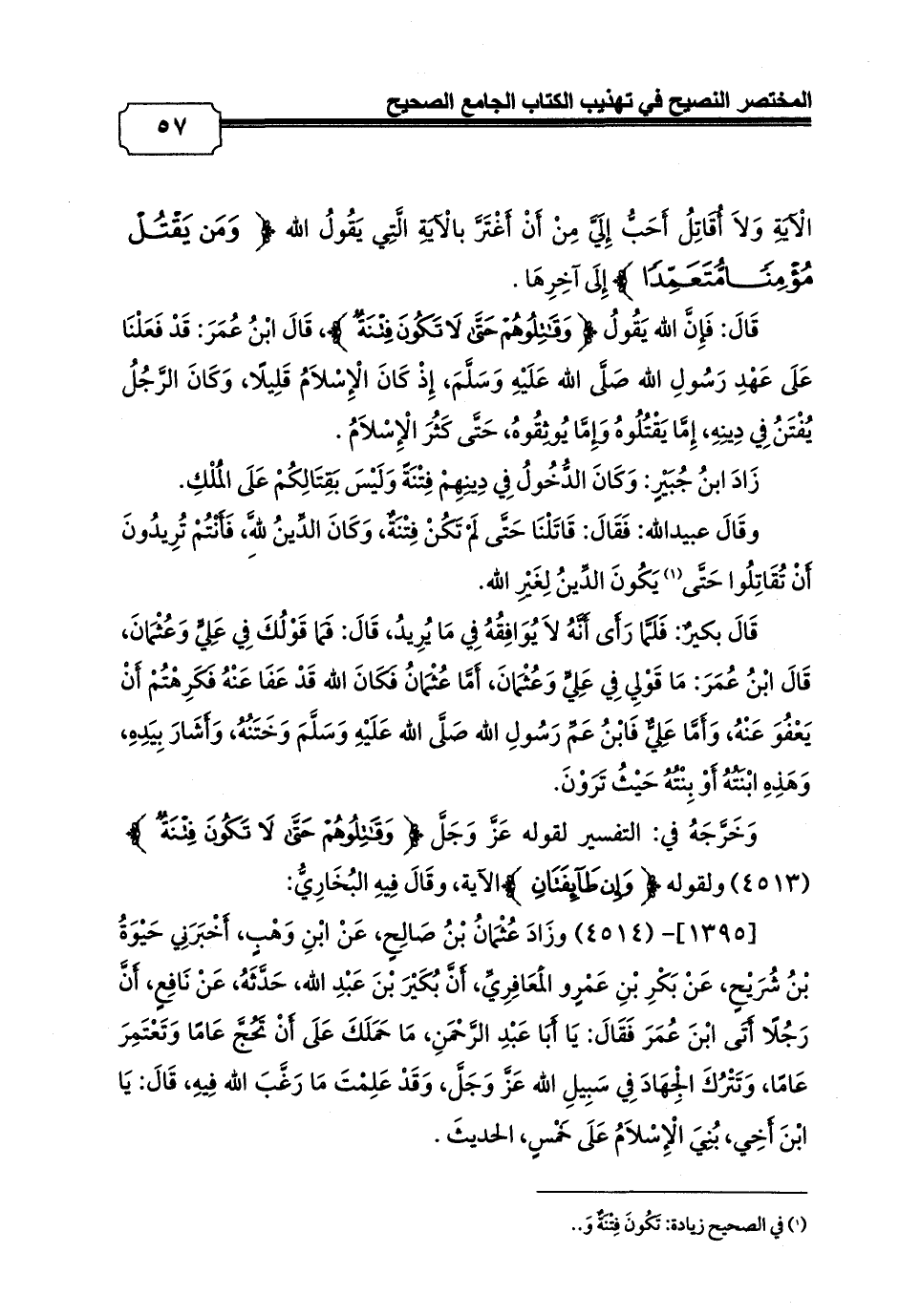 وَخَرَّجَهُ في: التفسير لقوله عَزَّ وَجَلَّ {وَقَاتِلُوهُمْ حَتَّى لَا تَكُونَ فِتْنَةٌ} (4513) ولقوله {وَإِنْ طَائِفَتَانِ} الآية, وقَالَ فِيهِ البُخَارِيُّ: