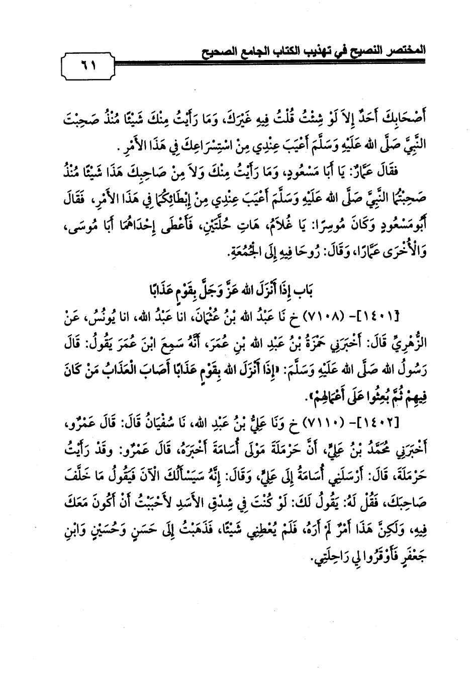 [1401]- (7108) خ نَا عَبْدُ الله بْنُ عُثْمَانَ, انا عَبْدُ الله, انا يُونُسُ, عَنْ الزُّهْرِيِّ قَالَ: أَخْبَرَنِي حَمْزَةُ بْنُ عَبْدِ الله بْنِ عُمَرَ, أَنَّهُ سَمِعَ ابْنَ عُمَرَ يَقُولُ: قَالَ رَسُولُ الله صَلَّى الله عَلَيْهِ وَسَلَّمَ: «إِذَا أَنْزَلَ الله بِقَوْمٍ عَذَابًا أَصَابَ الْعَذَابُ مَنْ كَانَ فِيهِمْ ثُمَّ بُعِثُوا عَلَى أَعْمَالِهِمْ».