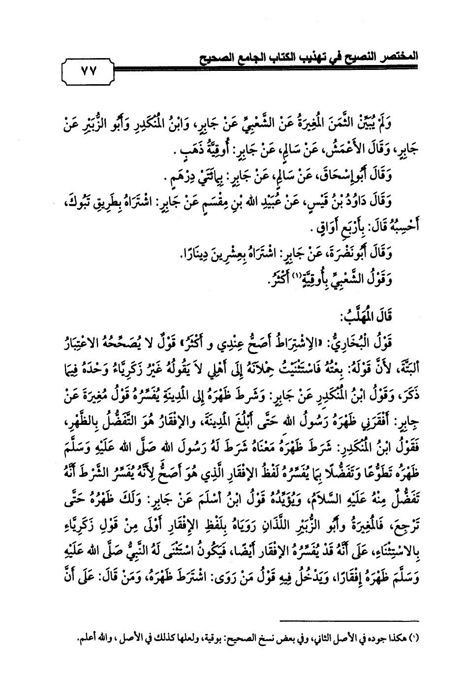 قَوْلُ الْبُخَارِيُّ: «الِاشْتِرَاطُ أَصَحُّ عِنْدِي وأَكْثَرُ» قَوْلٌ لا يُصَحِّحُهُ الاعْتِبَارُ ألبَتَّةَ، لأَنَّ قَوْلَهُ: بِعْتُهُ فَاسْتَثْنَيْتُ حِمْلاَنَهُ إِلَى أَهْلِي لاَ يَقُولُهُ غَيْرُ زَكَرِيَّاءُ وَحْدَهُ فِيمَا ذَكَرَ، وَقَوْلُ ابْنُ الْمُنْكَدِِرِ عَنْ جَابِرٍ: وَشَرطَ ظَهْرَهُ إِلى الْمَدِينَةِ يُفَسِّرُهُ قَوْلُ مُغِيرَةَ عَنْ جِابِرٍ: أَفْقَرَنِي ظَهْرَهُ رَسُولُ اللهِ حَتَّى أَبْلُغَ الْمَدِينَةَ، والإفْقَارُ هُوَ التَّفَضُّلُ بِالظَّهْرِ، فَقَوْلُ ابْنُ الْمُنْكَدِرِ: شَرَطَ ظَهْرَهُ مَعْنَاهُ شَرَطَ لَهُ رَسُولَ اللهِ صَلَّى الله عَلَيْهِ وَسَلَّمَ ظَهْرَُه تَطَوُّعًا وَتَفَضُّلًا بِمَا يُفَسِّرُهُ لَفْظُ الإفْقَارِ الَّذِي هُوَ أَصَحُّ لِأَنَّهُ يُفَسِّرُ الشَّرْطَ أَنَّهُ تَفَضُّلٌ مِنْهُ عَلَيْهِ السَّلاَمُ، وَيُؤَيِّدُهُ قَوْلُ ابْنُ أسْلَمَ عَنْ جَابِرٍ: وَلَكَ ظَهْرُهُ حَتَّى تَرْجِعَ، فَالْمُغِيرَةُ وأَبُو الزُّبَيْرِ اللَّذَانِ رَوَيَاهُ بِلَفْظِ الإِفْقَارِ أَوْلَى مِنْ قَوْلِ زَكَرِيَّاءِ بِالاسْتِثْنَاءِ، عَلَى أَنَّهُ قَدْ يُفَسِّرُهُ الإفْقَار أَيْضًا، فَيَكُونُ اسْتَثْنَى لَهُ النَّبِيُّ صَلَّى الله عَلَيْهِ وَسَلَّمَ ظَهْرَهُ إِفْقَارًا، وَيَدْخُلُ فِيهِ قَوْلُ مَنْ رَوَى: اشْتَرَطَ ظَهْرَهُ، وَمَنْ قَالَ: عَلَى أَنَّ