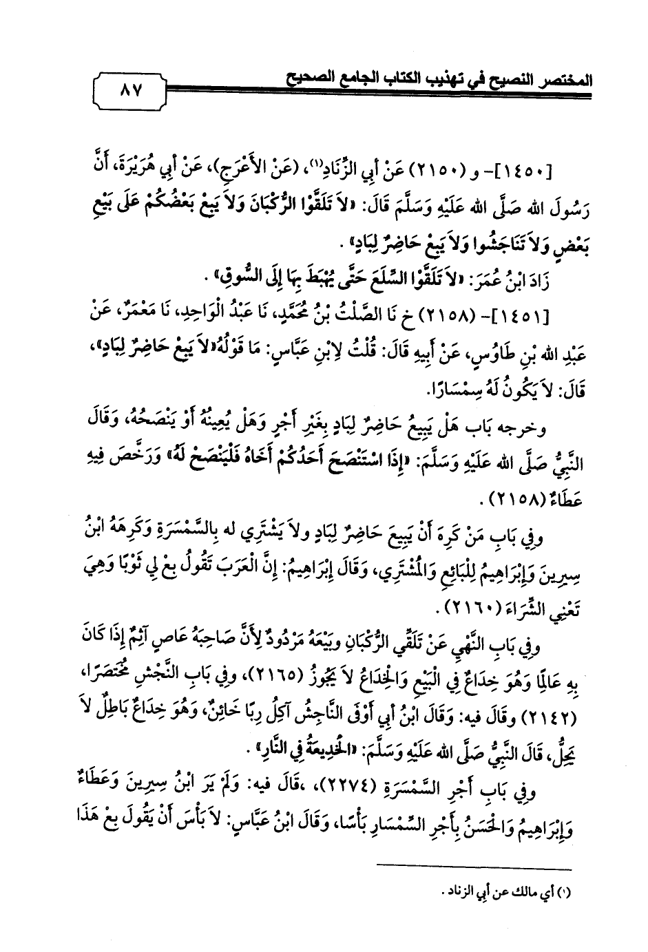 [1450]- و (2150) عَنْ أبِي الزِّنَادِ (¬1) , (عَنْ الأَعْرَجِ) , عَنْ أبِي هُرَيْرَةَ, أَنَّ رَسُولَ الله صَلَّى الله عَلَيْهِ وَسَلَّمَ قَالَ: «لاَ تَلَقَّوْا الرُّكْبَانَ وَلاَ يَبِعْ بَعْضُكُمْ عَلَى بَيْعِ بَعْضٍ وَلاَ تَنَاجَشُوا وَلاَ يَبِعْ حَاضِرٌ لِبَادٍ».