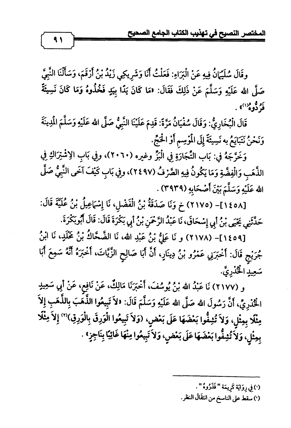و (2177) نَا عَبْدُ الله بْنُ يُوسُفَ, أَخْبَرَنَا مَالِكٌ, عَنْ نَافِعٍ, عَنْ أبِي سَعِيدٍ الْخُدْرِيِّ, أَنَّ رَسُولَ الله صَلَّى الله عَلَيْهِ وَسَلَّمَ قَالَ: «لاَ تَبِيعُوا الذَّهَبَ بِالذَّهَبِ إِلاَ مِثْلًا بِمِثْلٍ، وَلاَ تُشِفُّوا بَعْضَهَا عَلَى بَعْضٍ، (وَلاَ تَبِيعُوا الْوَرِقَ بِالْوَرِقِ) (¬2) إِلاَ مِثْلًا بِمِثْلٍ، وَلاَ تُشِفُّوا بَعْضَهَا عَلَى بَعْضٍ، وَلاَ تَبِيعُوا مِنْهَا غَائِبًا بِنَاجِزٍ».